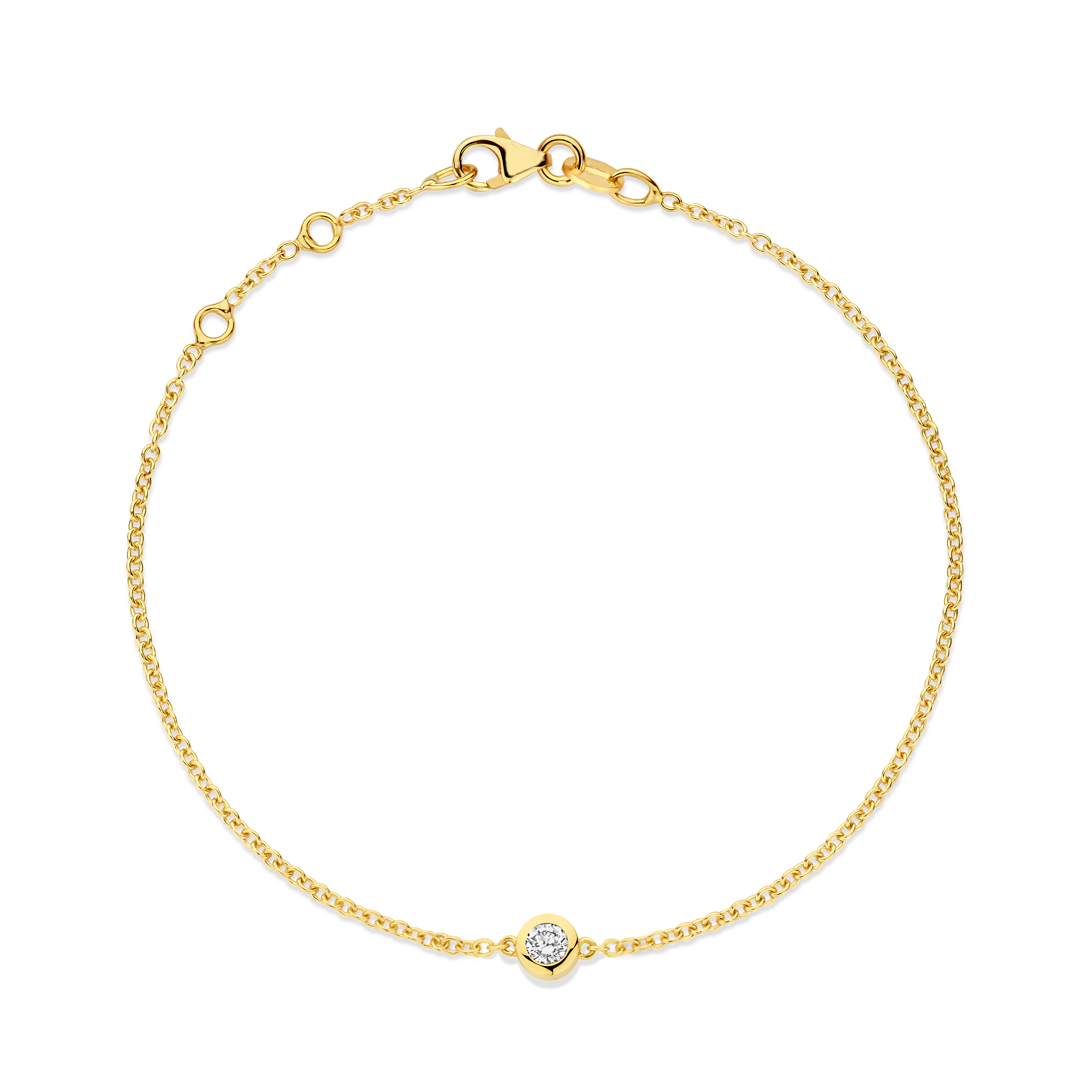 Deze prachtige armband is vervaardigd van hoogwaardig 14-karaats goud en is bezet met een schitterende diamant van 0.05 karaat, zorgvuldig gezet in een dichte ronde kast.