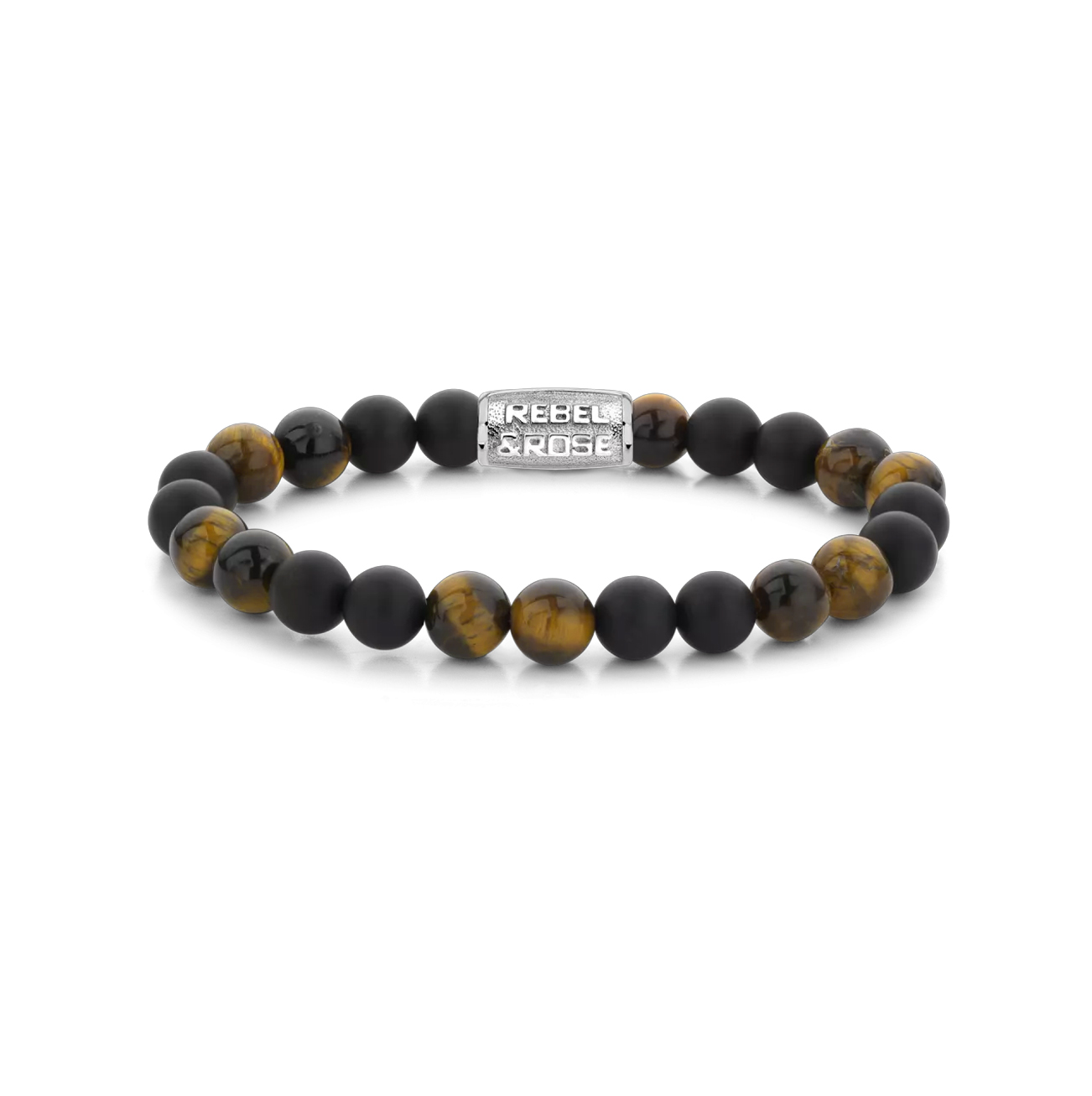 De Bead Matt Tiger Lily Twist big armband is handgemaakt van 8 mm matte natuurstenen, zoals Onyx en Tijgeroog, en voorzien van een zilverkleurige sluiting.