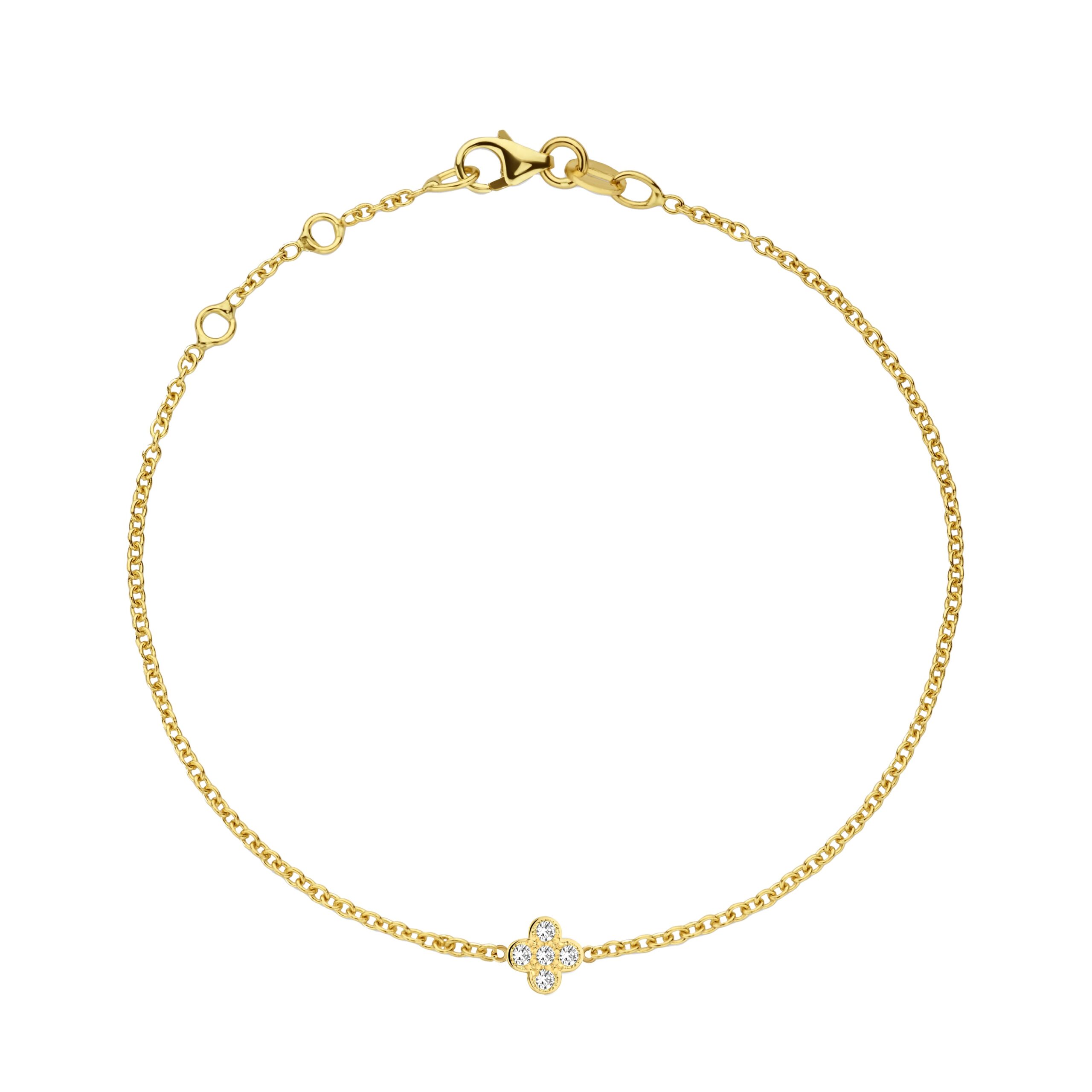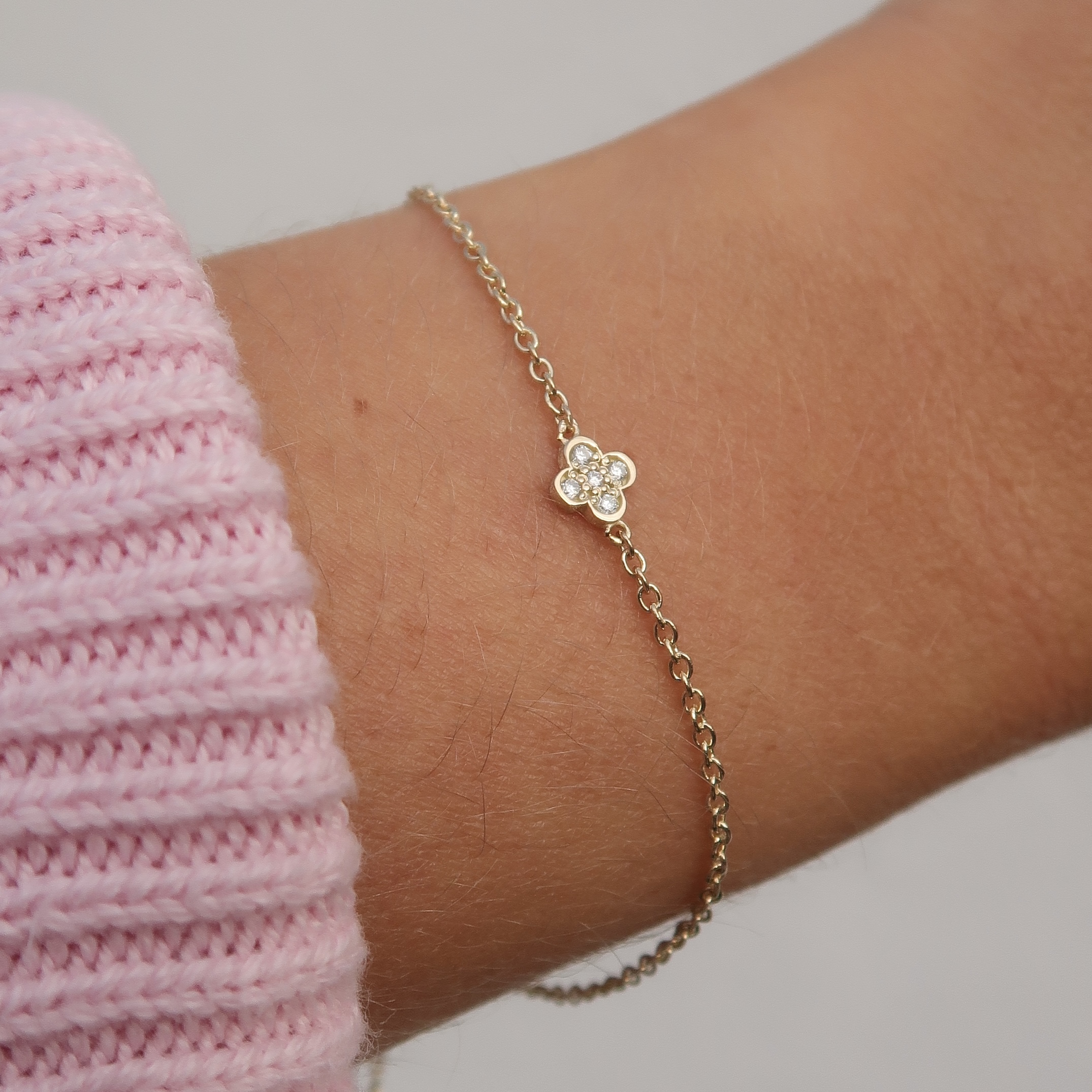 De Leaf Dicht Pavé armband tilt hetzelfde ontwerp naar een hoger niveau: de dichte leaf-bedel is pavé bezet met vijf fonkelende diamanten tussen een 14 karaats gouden armbandje.