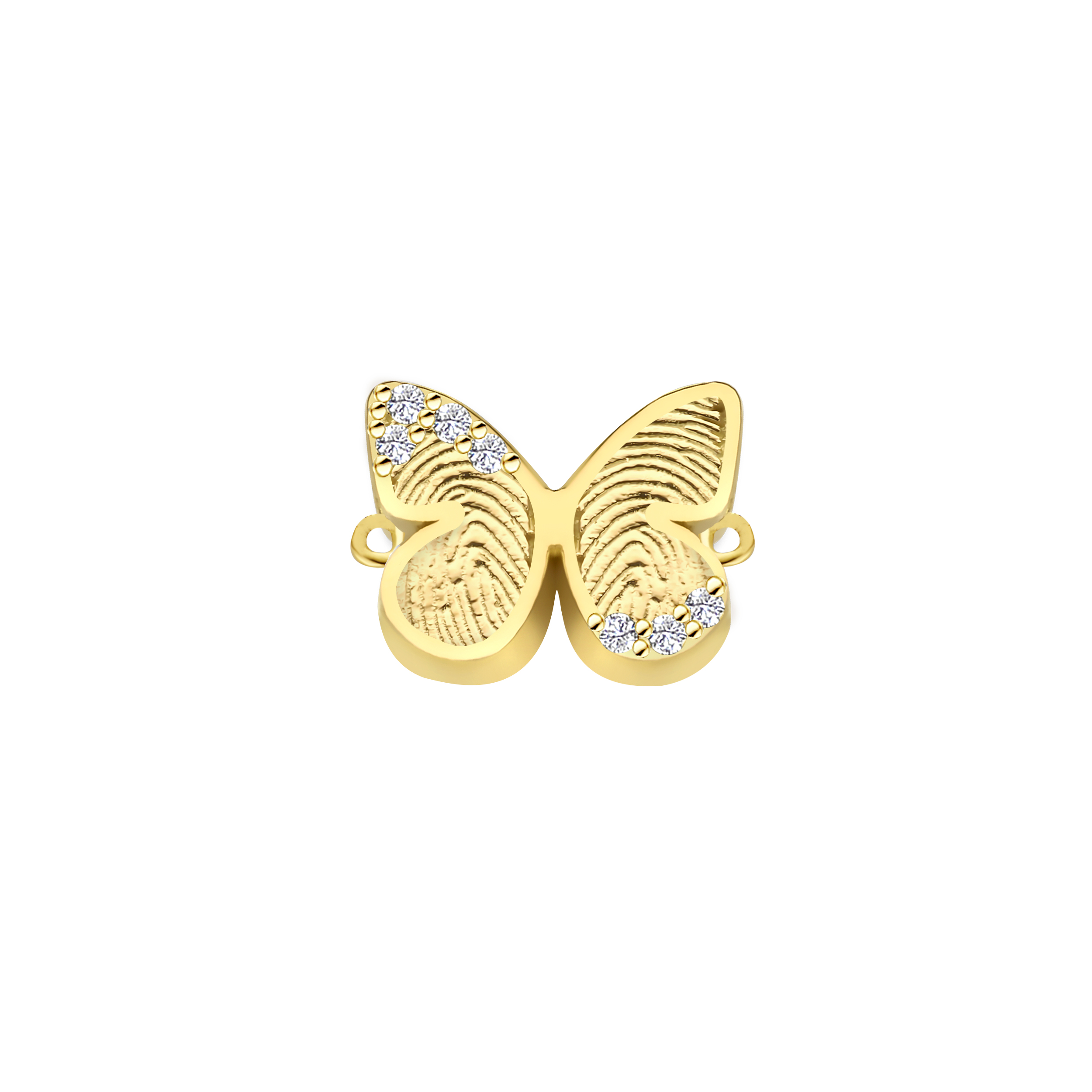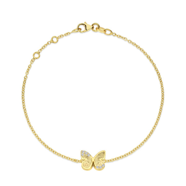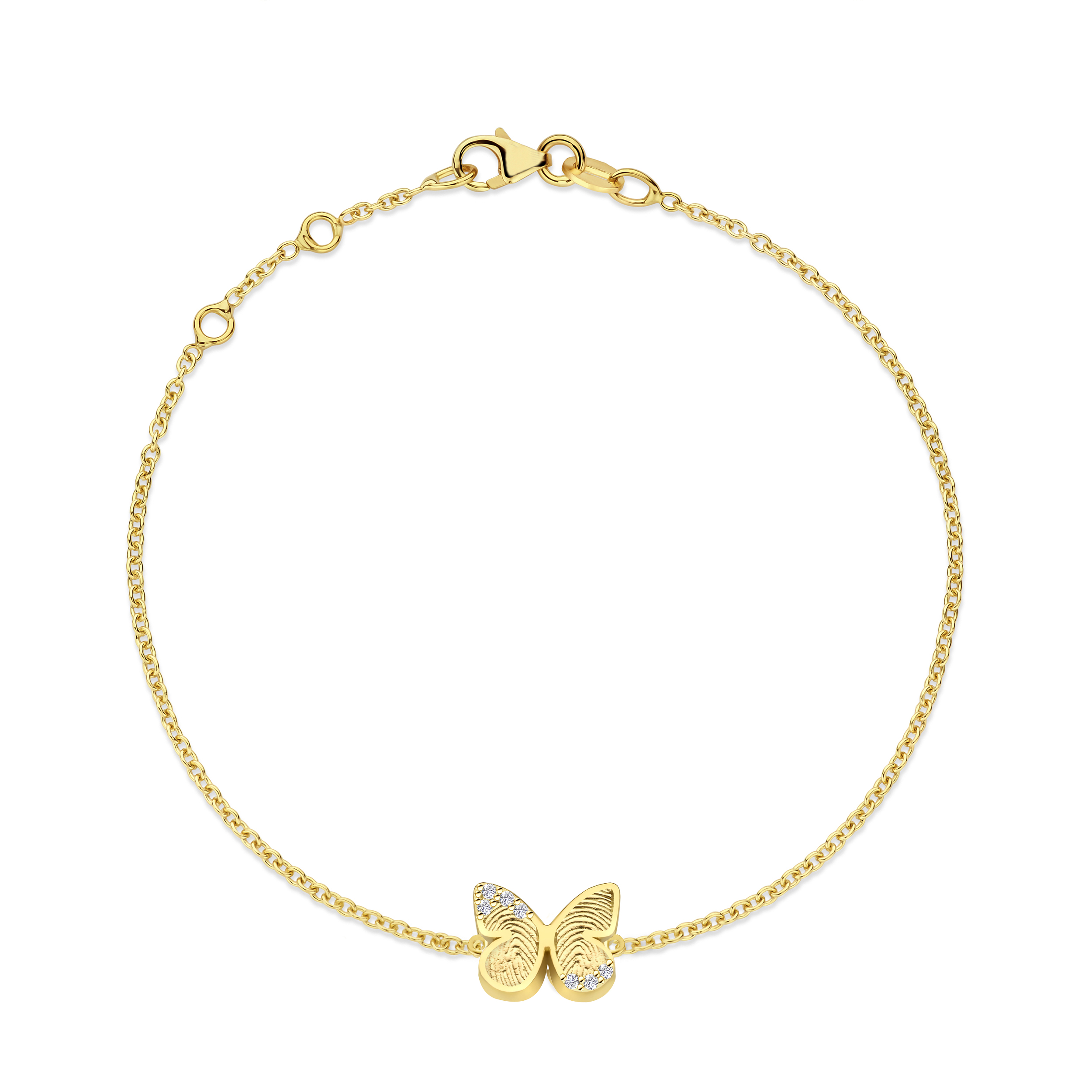 De combinatie van de elegante vlindervorm, de persoonlijke vingerafdruk en de schitterende diamanten maakt dit armbandje tot een bijzonder herinneringssieraad – een liefdevol symbool dat je dierbare momenten altijd dichtbij houdt.