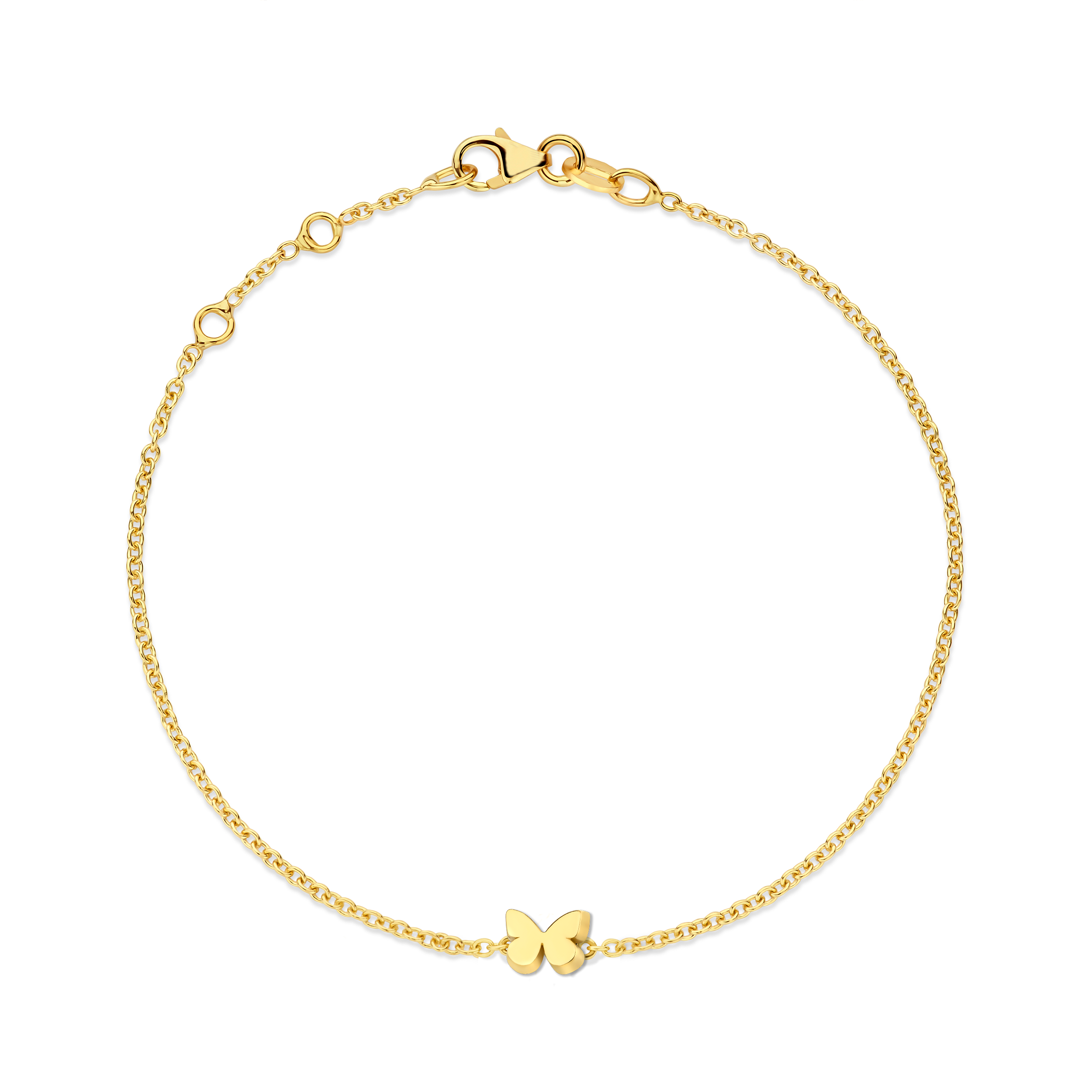 Deze mooie ankerarmband is gemaakt van 14-karaats goud en heeft een schattige vlinderbedel.