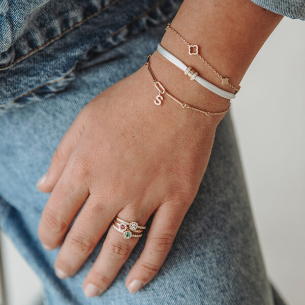 Deze 14 karaats gouden bedel is rondom gegraveerd met één initiaal of symbool dat zich acht keer herhaalt – subtiel, krachtig en helemaal van jou.