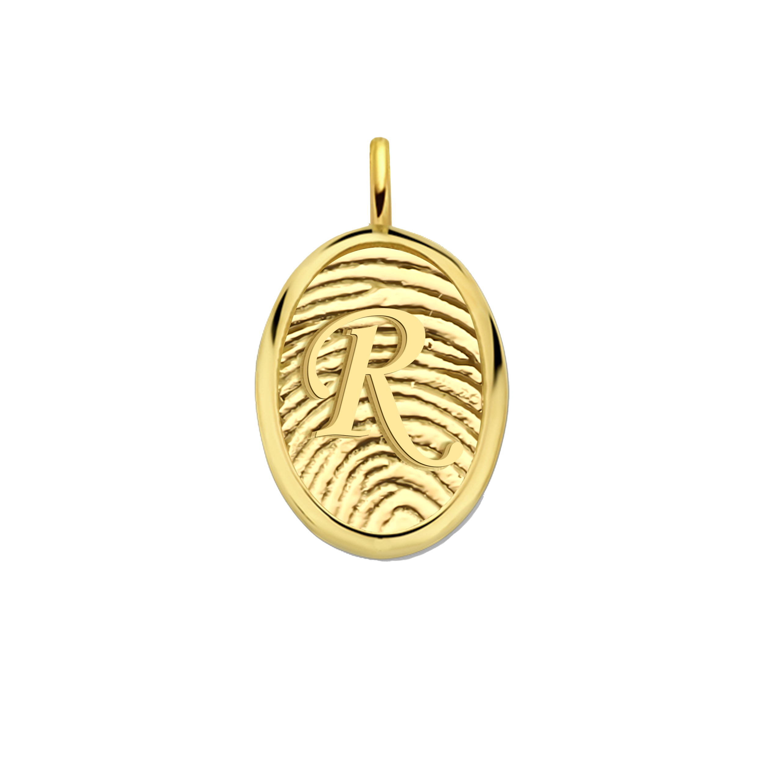 Deze tijdloze hangbedel is verkrijgbaar in 14 karaats goud en kan worden voorzien van een verfijnde 3D vingerafdruk én een initiaal naar keuze in het sierlijke Monotype Corsiva-lettertype.