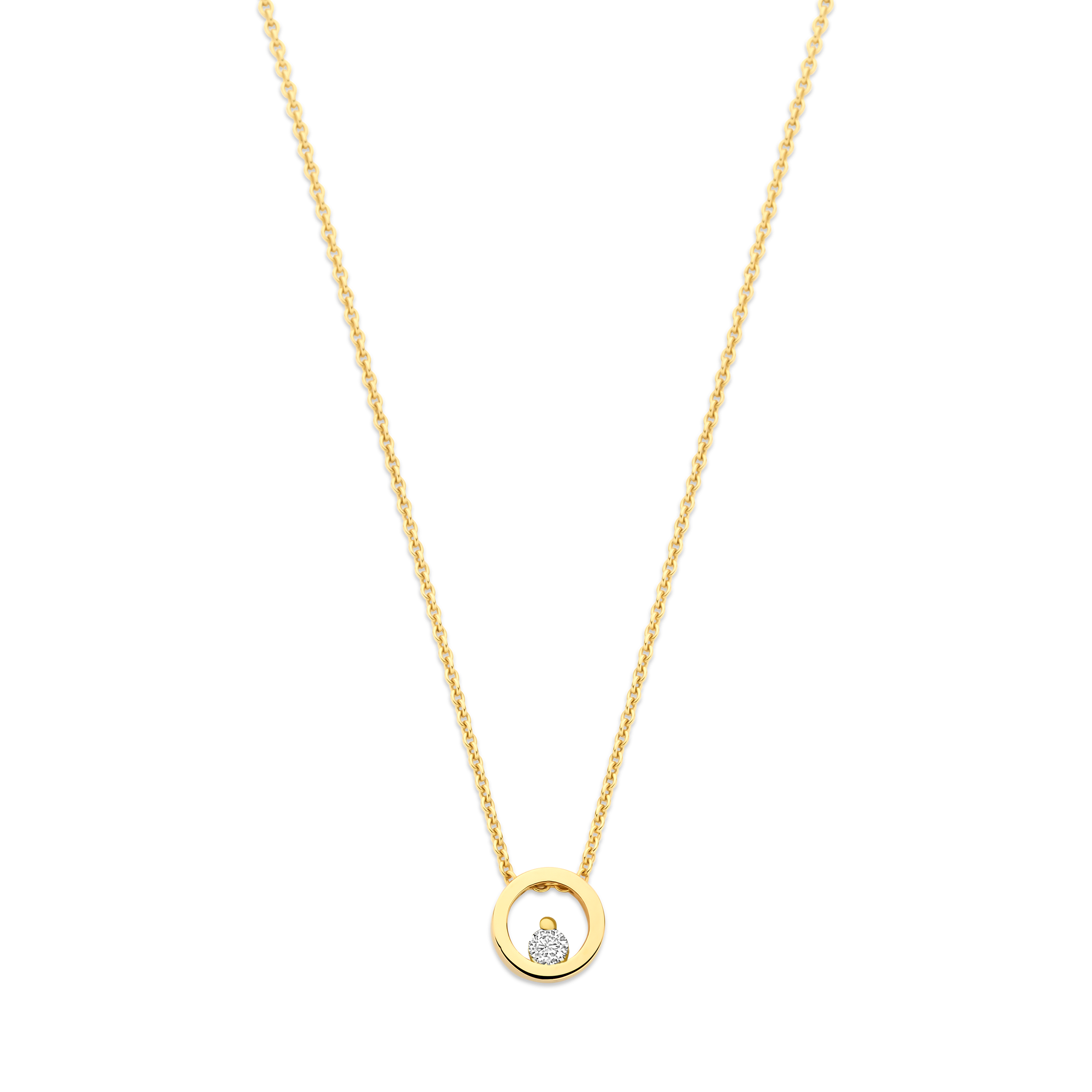 De ketting Circle 010 is een elegante ketting met een schitterende diamant van 0.10 ct in het midden van de cirkel, die subtiele maar opvallende schoonheid uitstraalt.