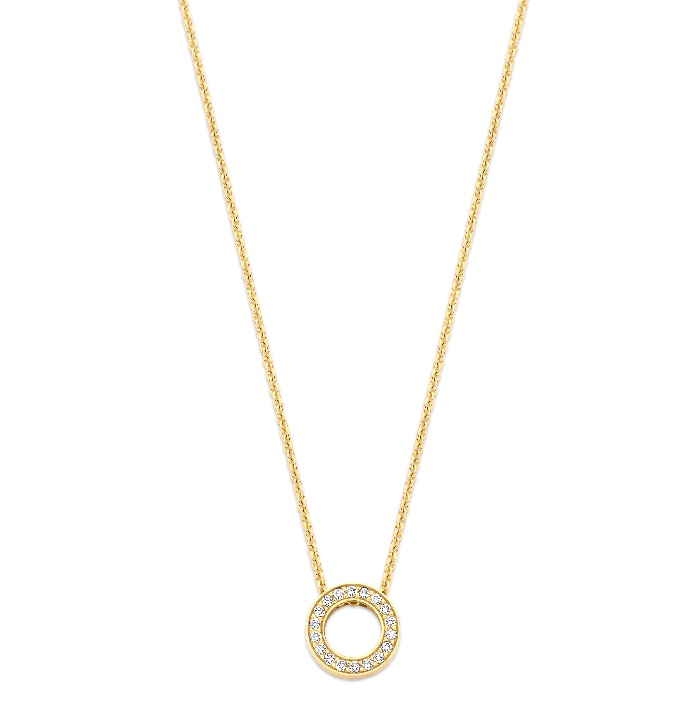 Met 16 sprankelende witte diamanten pavé gezet in de cirkel, voegt deze ketting een extra vleugje schittering toe met een totaal gewicht van 0.18 ct.