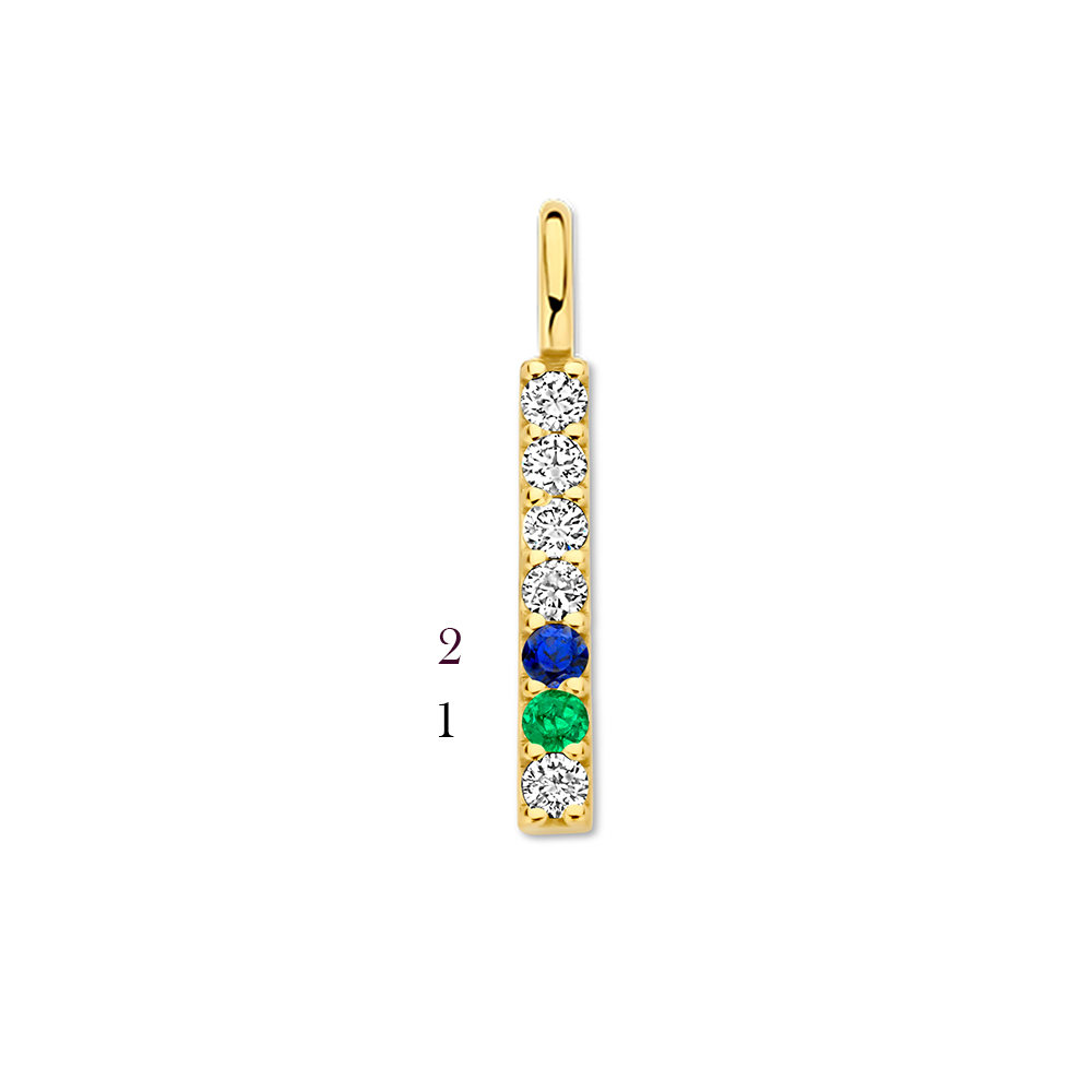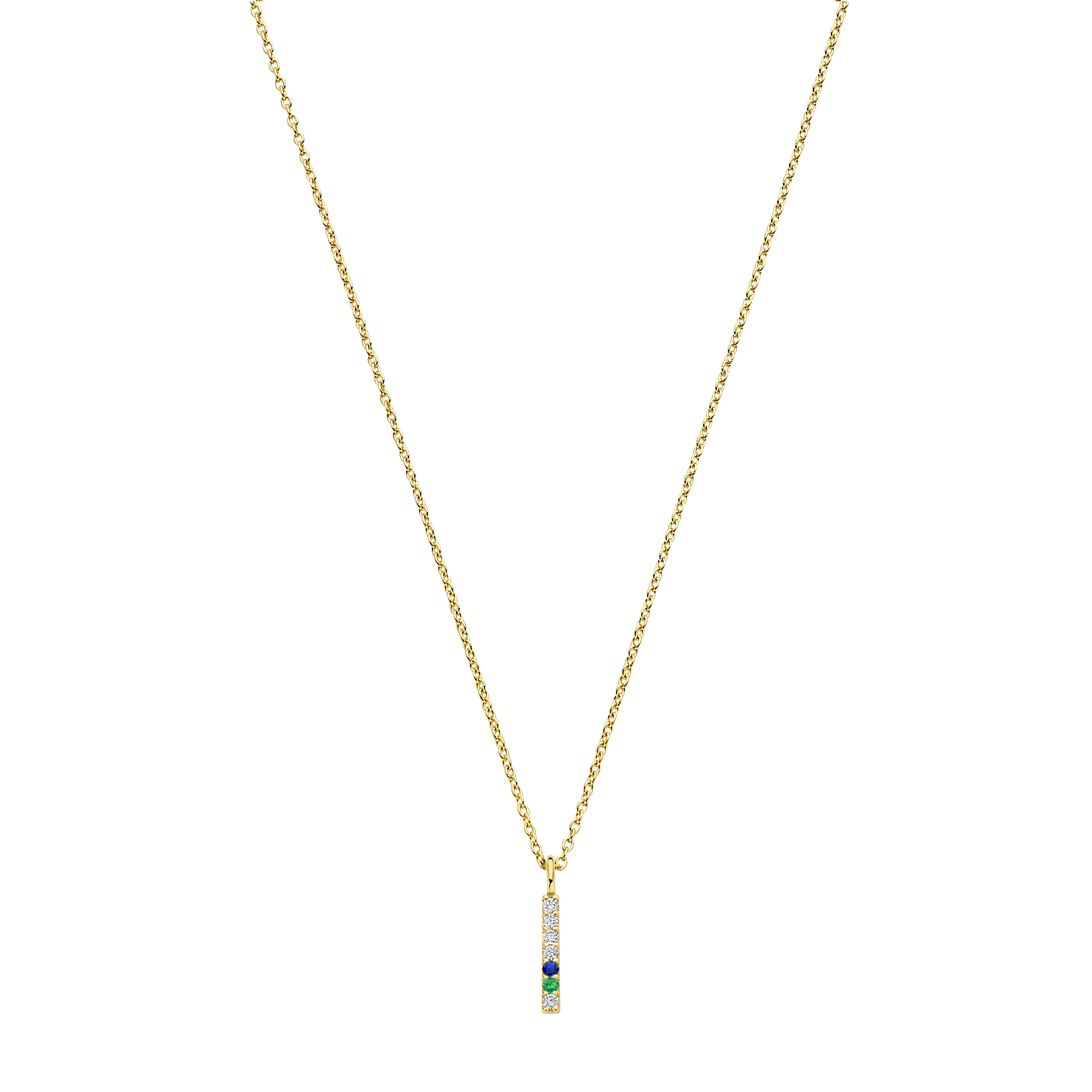De ketting Diamondbar Milestone is vervaardigd uit 14 karaats goud en voorzien van een gouden hanger in staafvorm, pavé bezet met vijf witte diamanten en twee geboortestenen naar keuze.