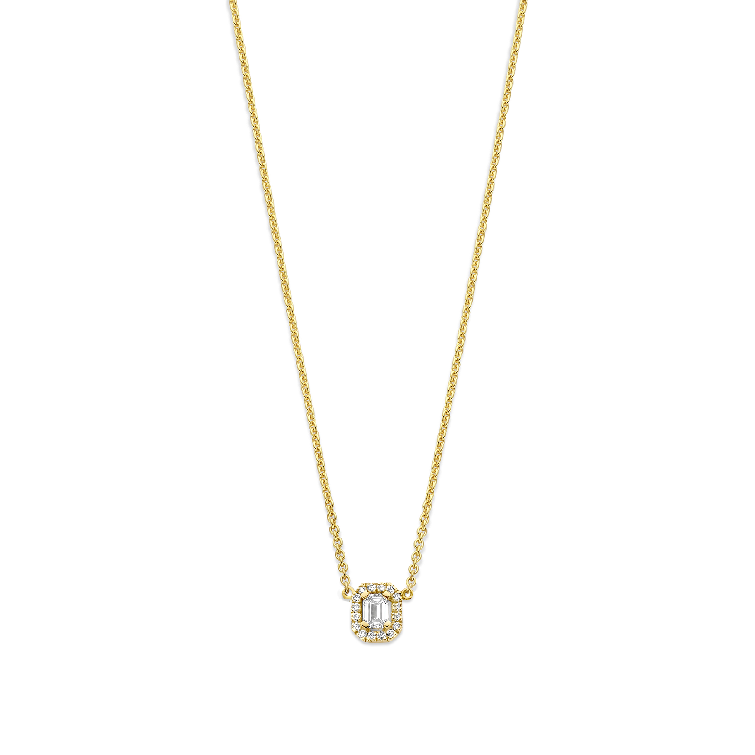 De strakke halo van de emerald-cut in combinatie met de sprankelende diamant geeft de ketting een tijdloze en luxueuze uitstraling!
