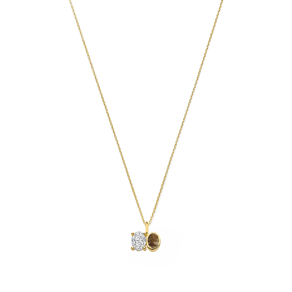 Een verfijnde ketting van 14 karaats goud met een hanger bestaande uit een ovale lab grown diamant en een gouden ovaaltje waarop een initiaal geplaatst kan worden. De hanger valt subtiel onder de ketting, waardoor de diamant en de persoonlijke letter mooi samen naar voren komen.