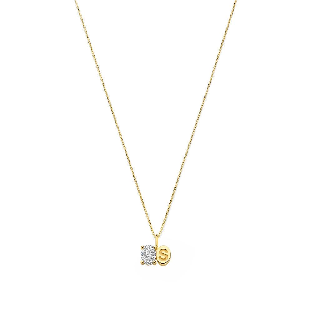 Een verfijnde ketting van 14 karaats goud met een hanger bestaande uit een ovale lab grown diamant en een gouden ovaaltje waarop een initiaal geplaatst kan worden. De hanger valt subtiel onder de ketting, waardoor de diamant en de persoonlijke letter mooi samen naar voren komen.