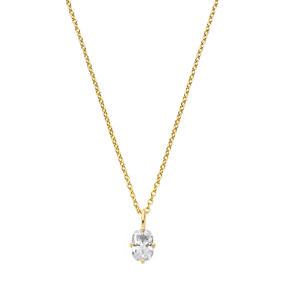 Een verfijnde ketting van 14 karaats goud met een Toi et Moi hanger. De hanger is gezet met twee lab grown diamanten van elk 0.25 ct in een ovale en peervormige slijpvorm.
