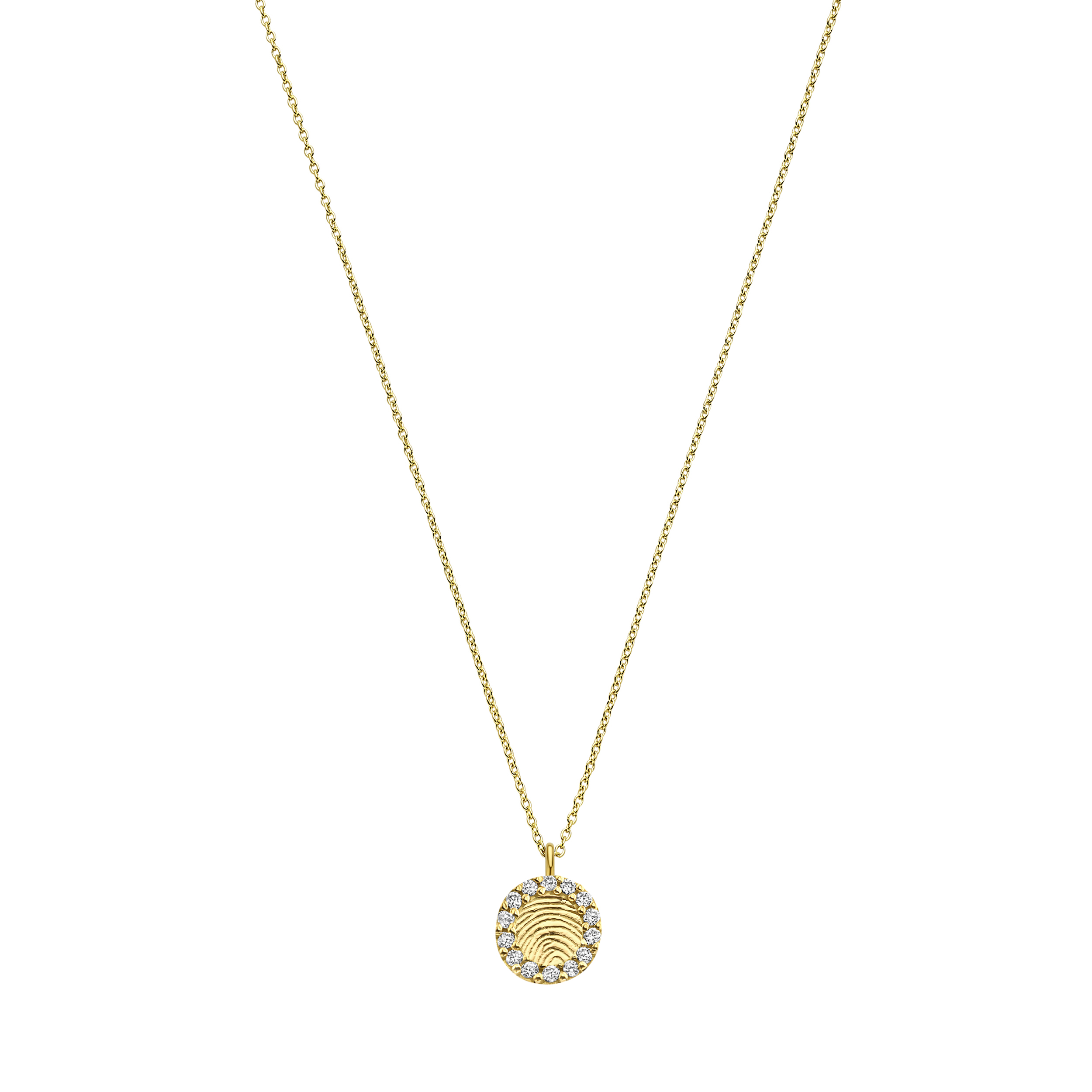Deze elegante ketting is voorzien van een ronde Halo hanger in 14 karaats goud, die wordt gepersonaliseerd met een verfijnde 3D vingerafdruk.
