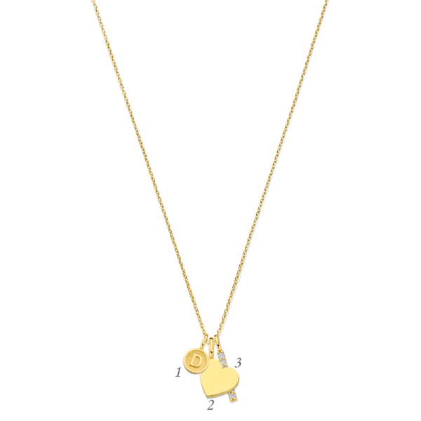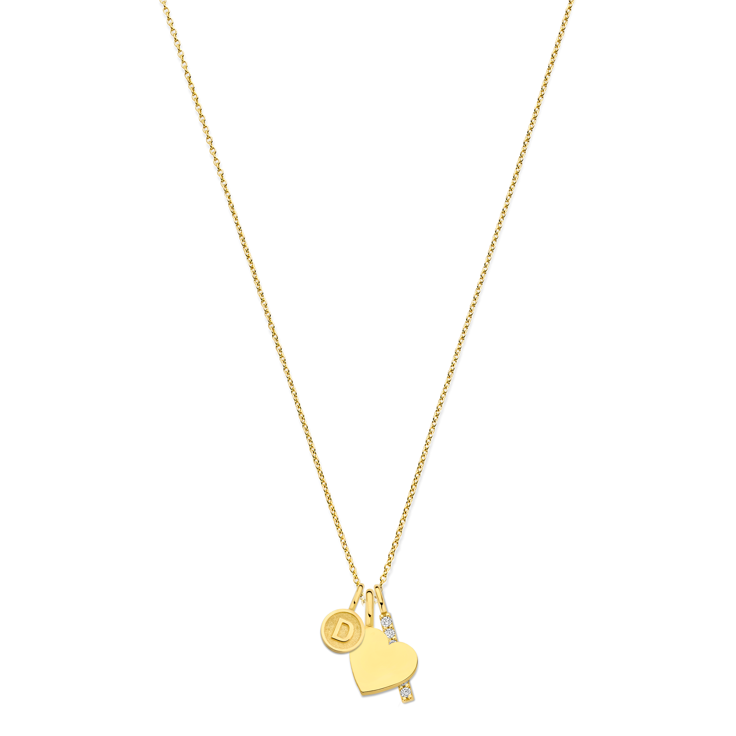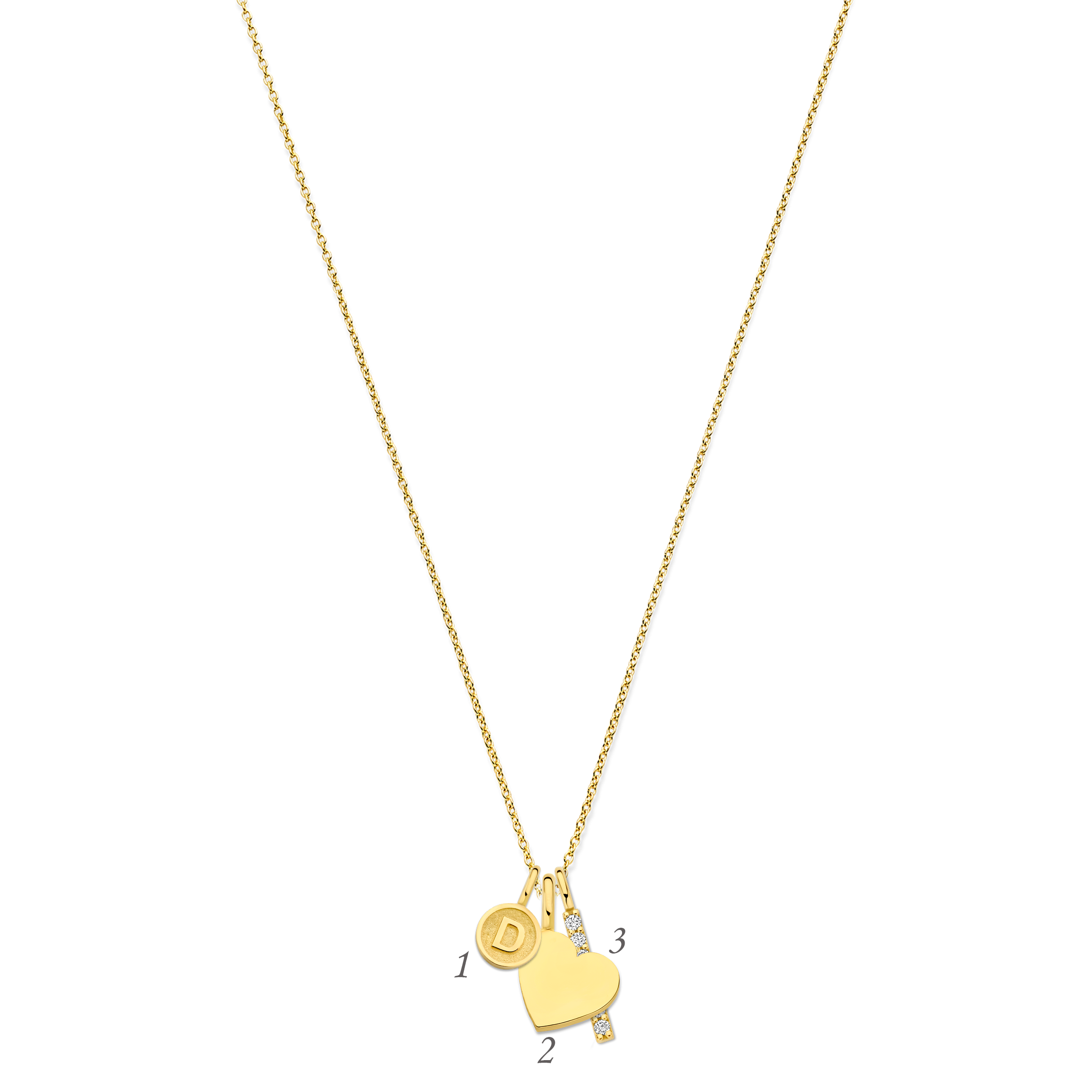 Ontwerp jouw unieke Minioro ketting met hangbedels uit de Letter Love Collectie en combineer de bedels met andere hangbedels uit de collecties toe, zoals een Diamondbar Tag, Ovalia, initiaal en symbool.