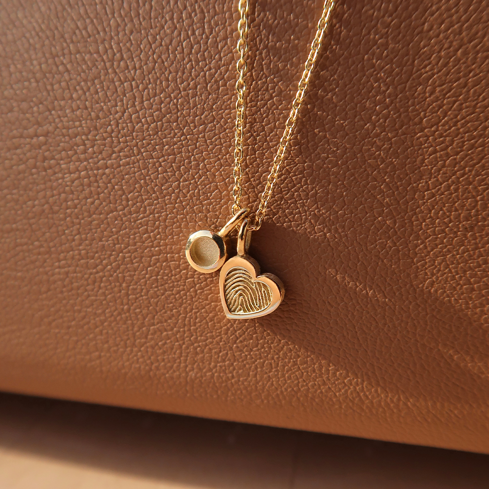 Deze tijdloze ketting is voorzien van een hartvormige hanger in 14 karaats goud, die kan worden gepersonaliseerd met een 3D vingerafdruk.