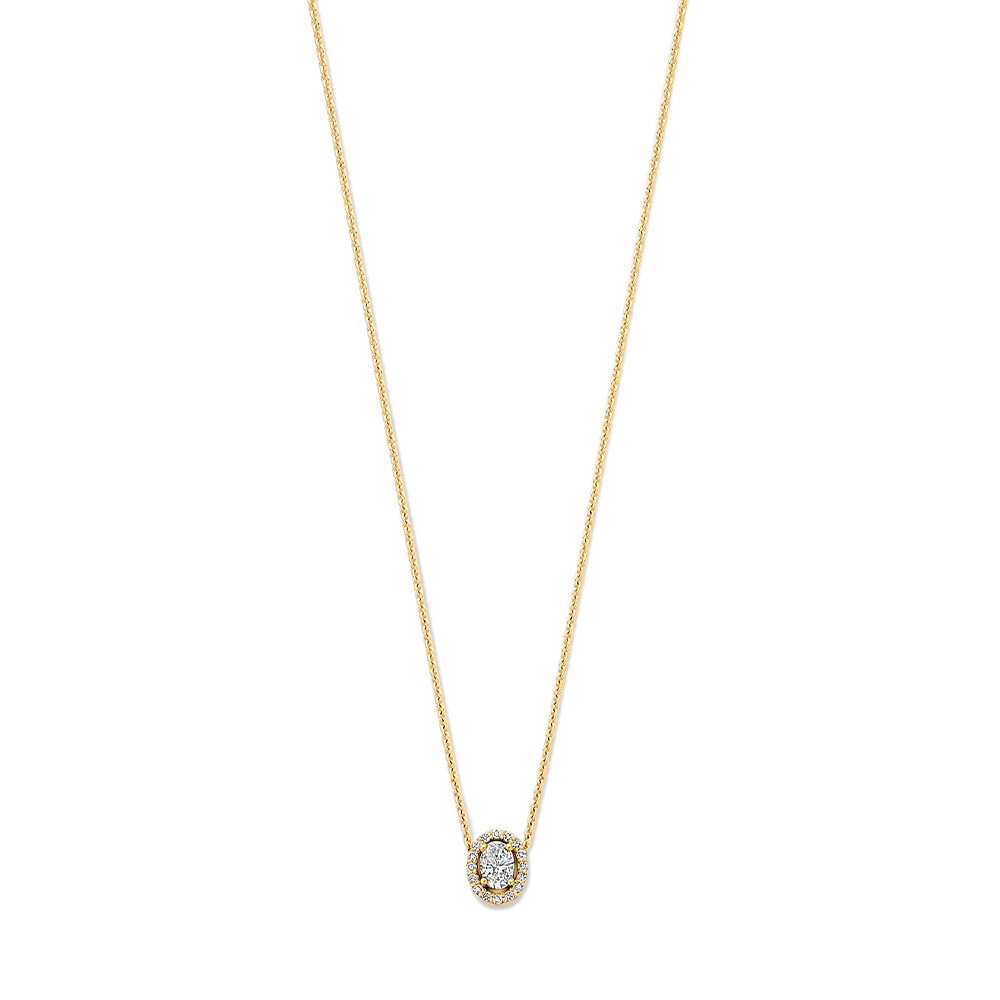 Een verfijnde ketting van 14 karaats goud met een 0.25 ct lab grown diamant in ovale slijpvorm, omringd door een halo van kleine briljant geslepen diamanten. De ovale middensteen wordt mooi benadrukt door de fonkelende rand van kleine diamanten.