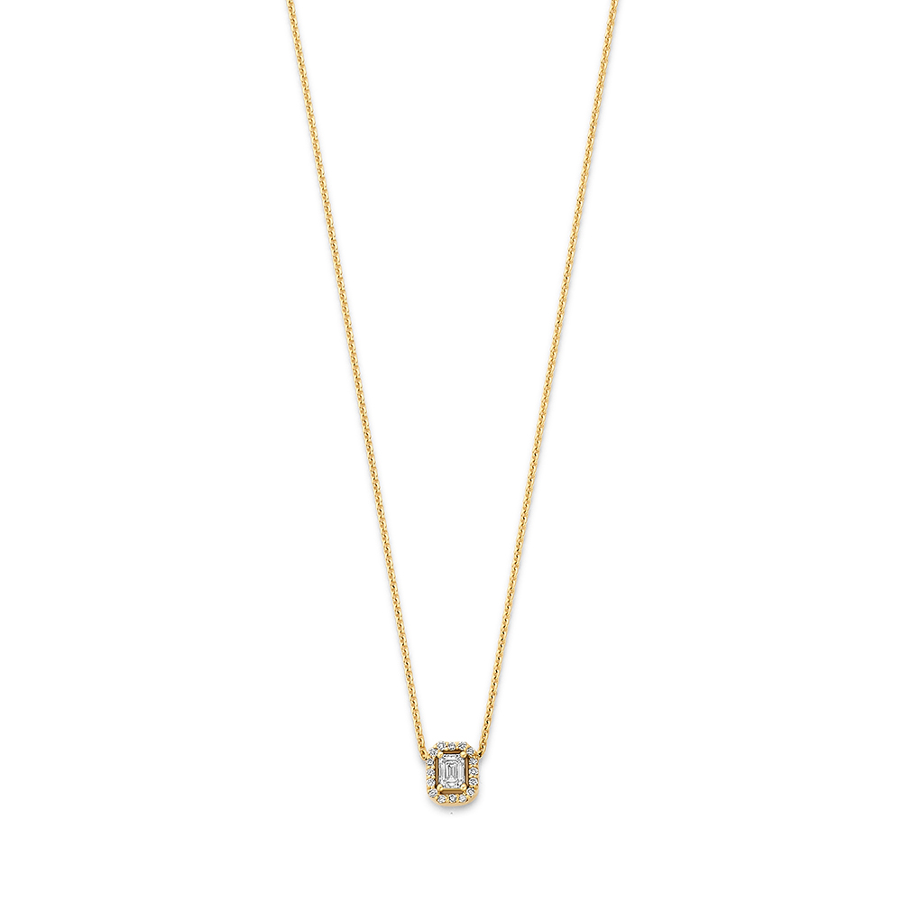 Een verfijnde ketting van 14 karaats goud met een lab grown 0.25 ct diamanten bedel in emerald cut, omringd door een halo van kleine briljant geslepen diamanten. De strakke vorm van de middensteen wordt mooi aangevuld door de fonkelende rand van kleine diamanten.