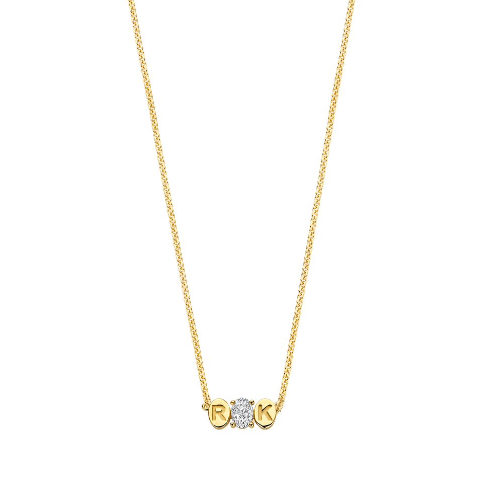 Een verfijnde ketting van 14 karaats goud met drie subtiele elementen naast elkaar. In het midden staat een 0.25 ct ovale lab grown diamant, met aan beide zijden een kleine ovale bedel waarop een initiaal geplaatst kan worden.
