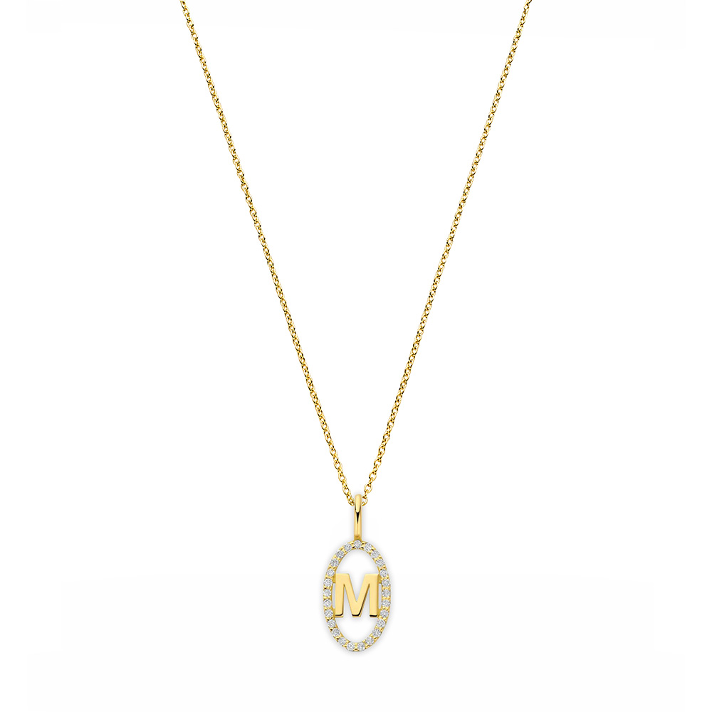 Een verfijnde ketting van 14 karaats goud met een ovale hanger. De hanger is omringd door een halo van kleine diamanten en heeft in het midden ruimte voor een persoonlijke initiaal.