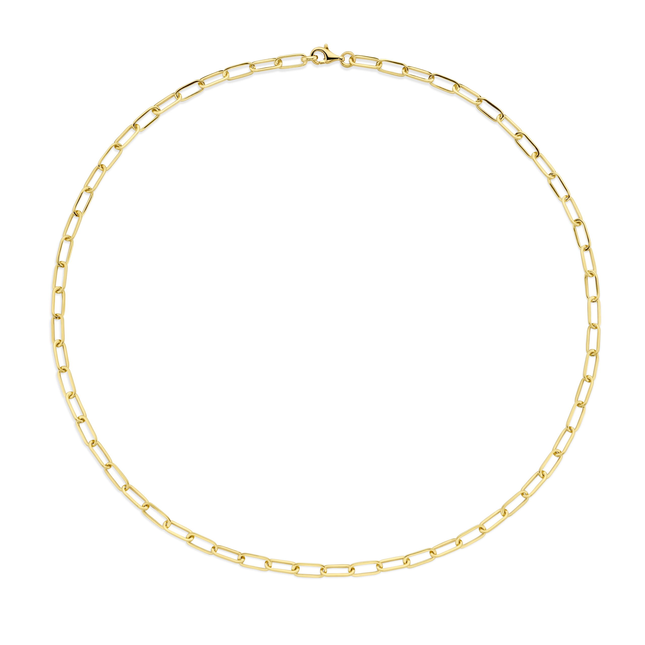 Een massieve 14-karaats geelgouden paperclipketting met een schakelbreedte van 3,0 mm. De ketting is voorzien van een stevige karabijnsluiting en heeft een lengte van 45 cm. Perfect om zo te dragen of te personaliseren met onze leuke hangbedels!