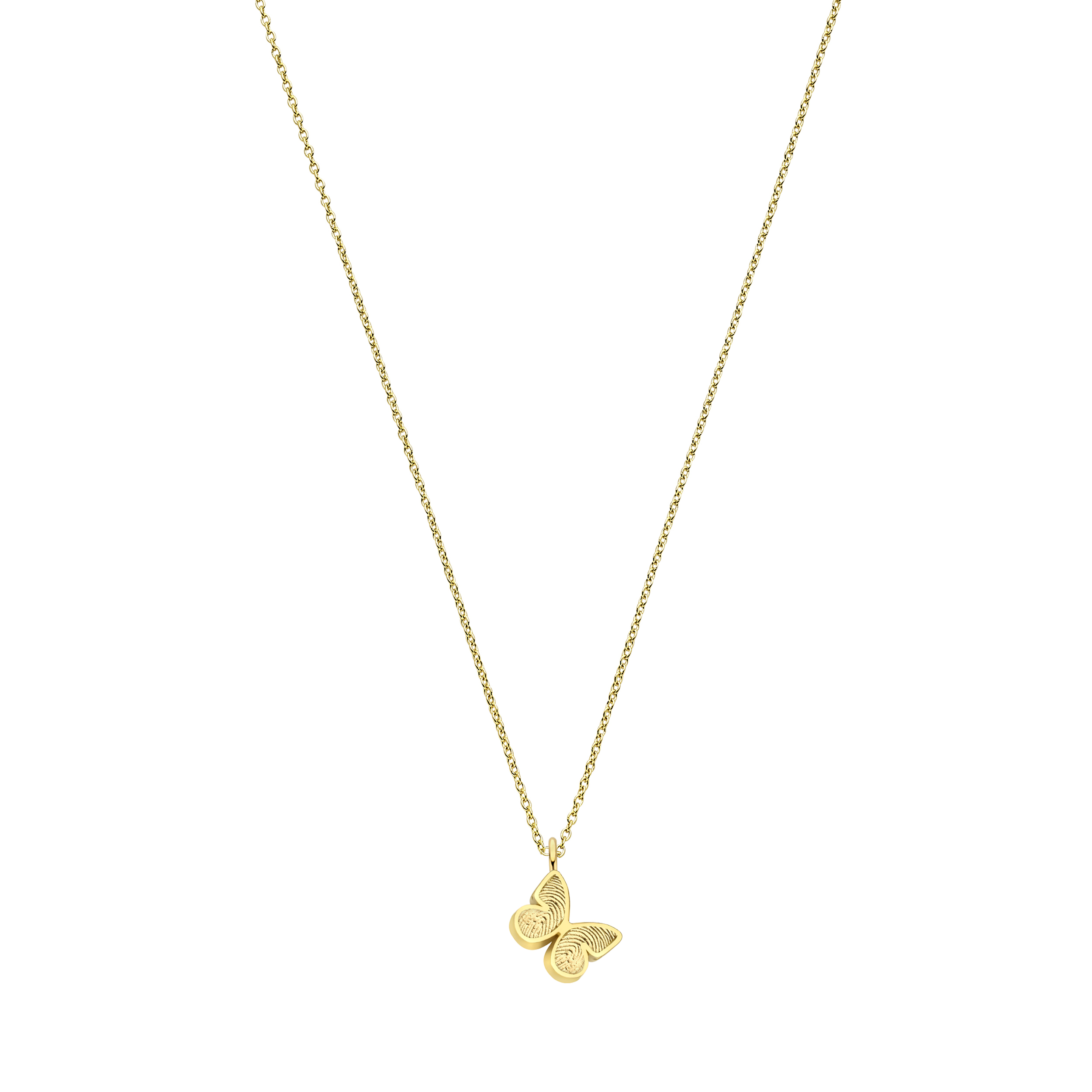 Deze verfijnde 14-karaats gouden ketting is voorzien van een sierlijke Vlinder hanger, die kan worden gepersonaliseerd met een unieke 3D vingerafdruk.
