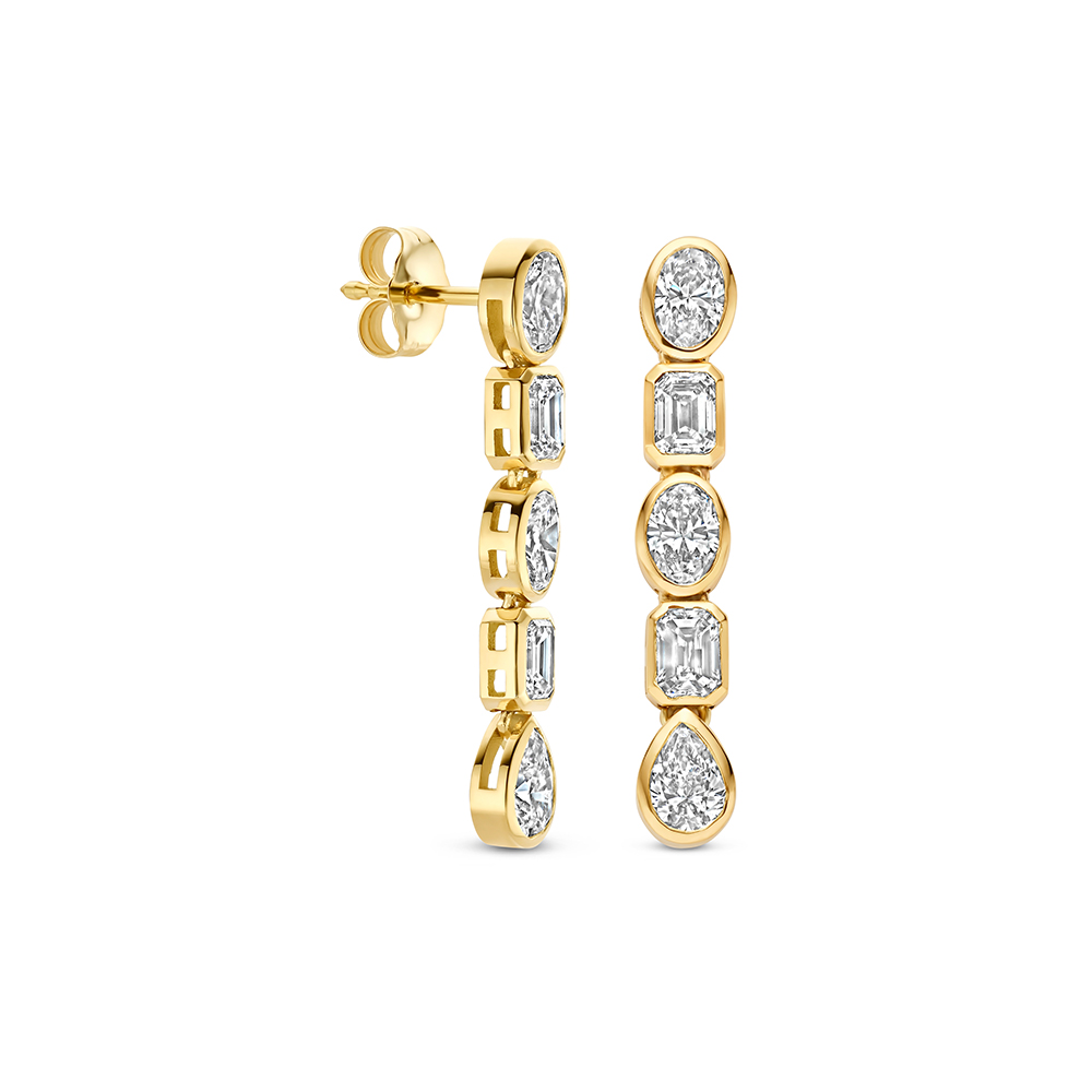 Elegante oorhangers van 14 karaats goud, opgebouwd uit een speelse combinatie van verschillende slijpvormen: ovaal, emerald en peer geslepen lab grown diamanten van elk 0.25 ct. De stenen zijn in een gladomrand ontwerp gezet, wat zorgt voor een moderne en strakke uitstraling.
