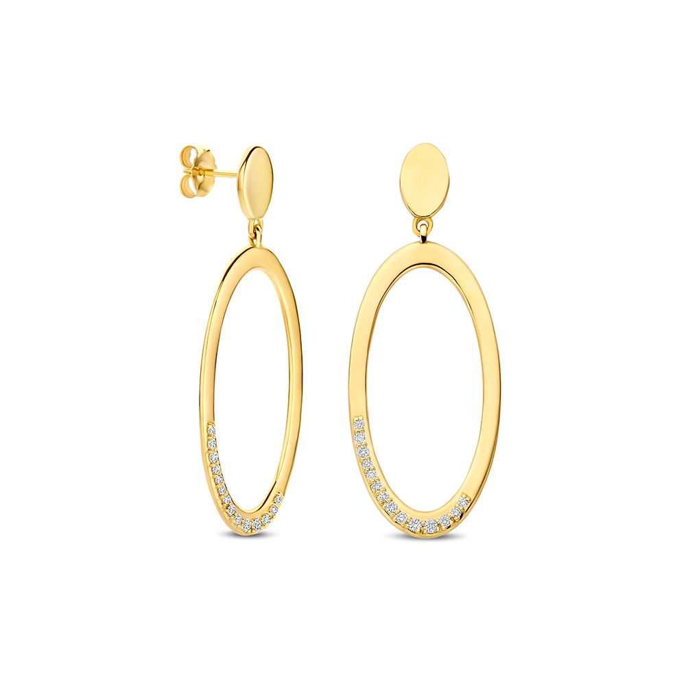 Elegante oorhangers van 14 karaats goud met een verfijnde, ovale vorm. Aan de onderzijde is een rij briljant geslepen lab grown diamanten subtiel verwerkt, die zorgt voor een zachte, sprankelende touch bij elke beweging.