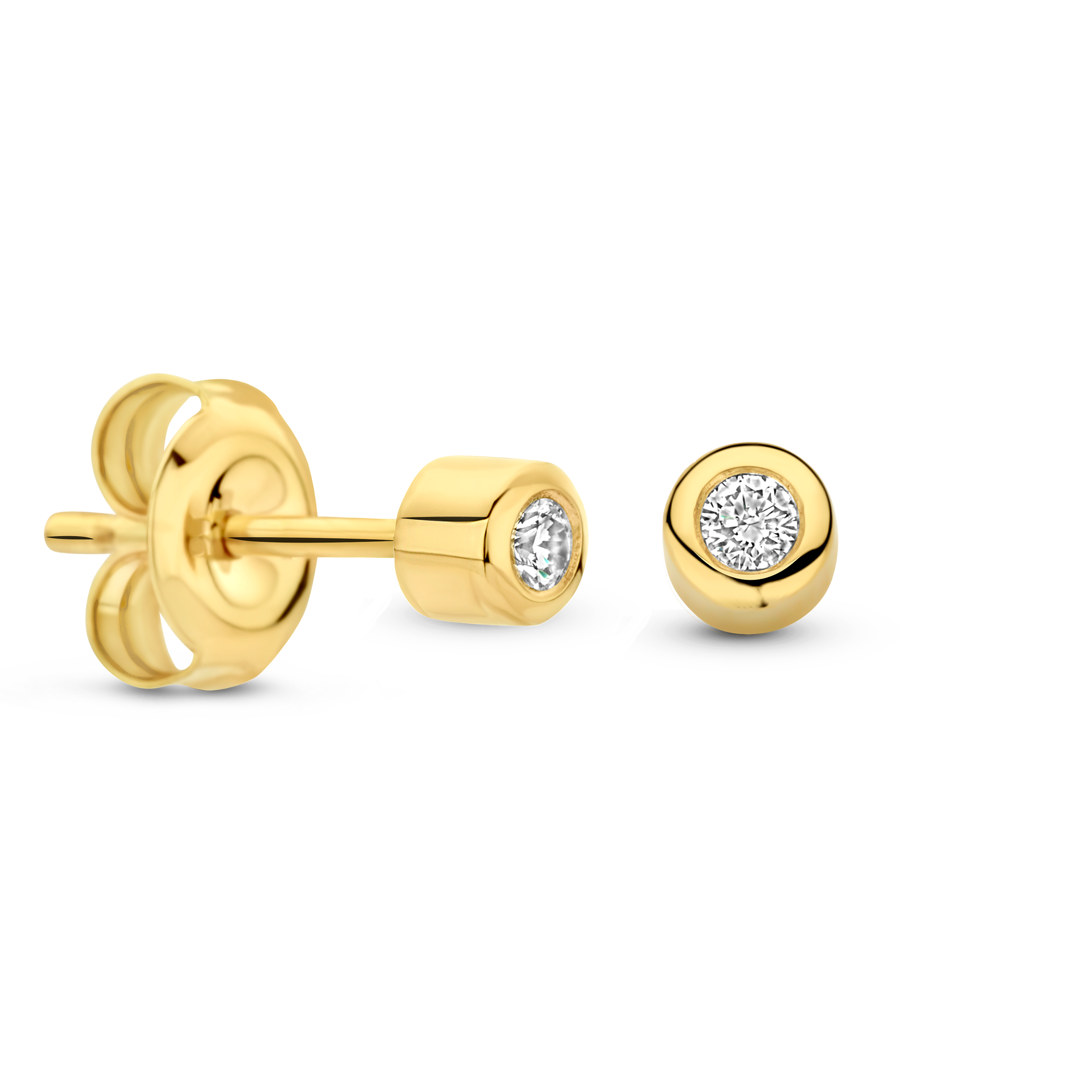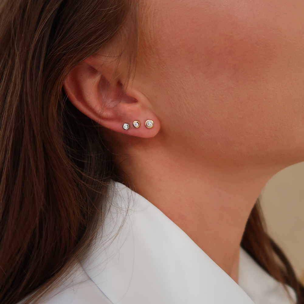 Ga voor tijdloze elegenatie met onze favorieten: de grotere gladde oorstekers Diamant, gezet in een dichte ronde kast.