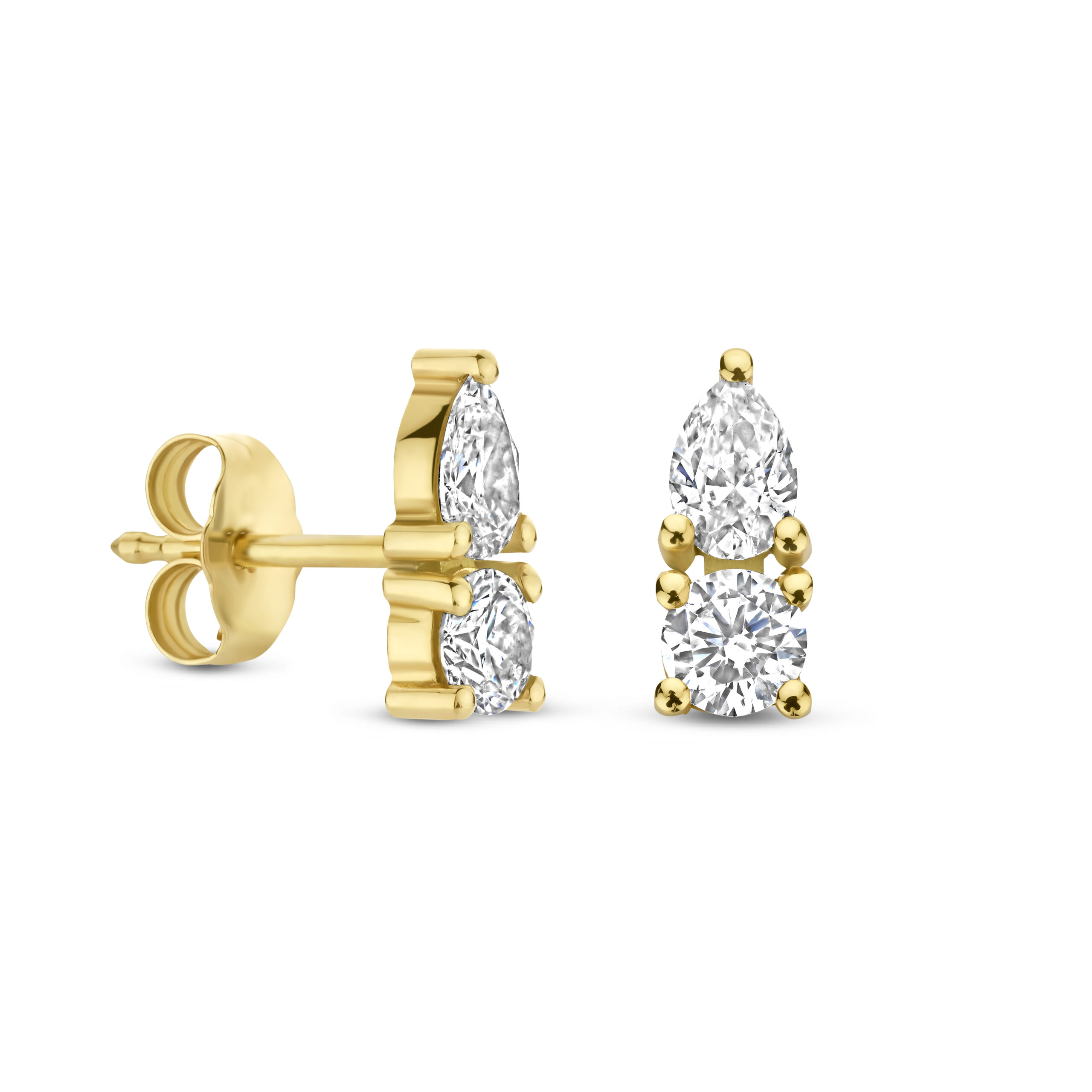 Elke oorsteker heeft een briljant geslepen diamant van 0.25 ct en een peergeslepen diamant van 0.25 ct.