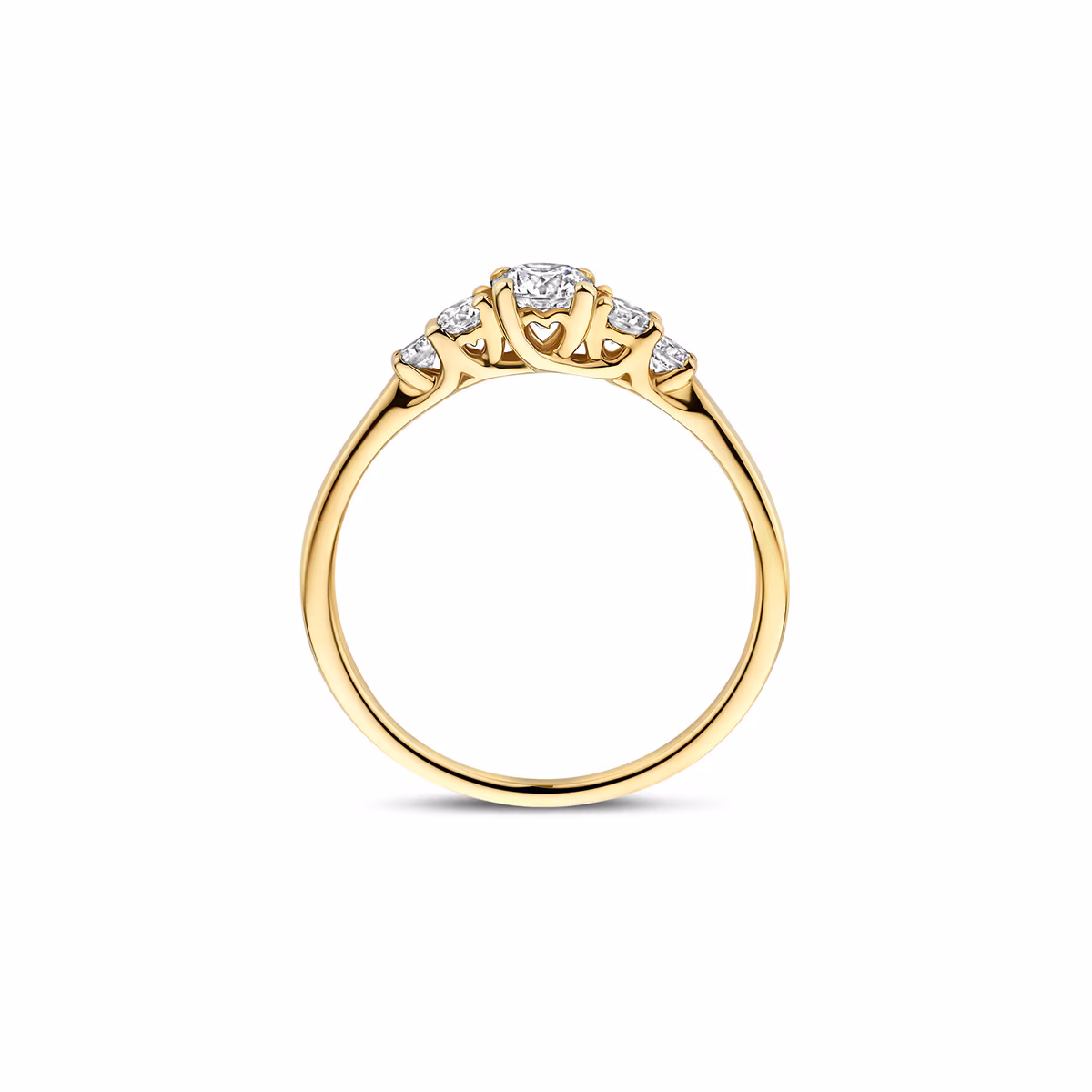 Maak kennis met deze 14 karaat gouden ring met vijf lab-grown diamanten. De opvallende middensteen wordt omringd door vier kleinere zijdiamanten in pavé-zetting, wat een mooie sprankeling geeft. Dankzij de slanke band draag je hem makkelijk elke dag en voegt hij een verfijnde touch toe aan je collectie. Deze ring is van het merk Blush.
