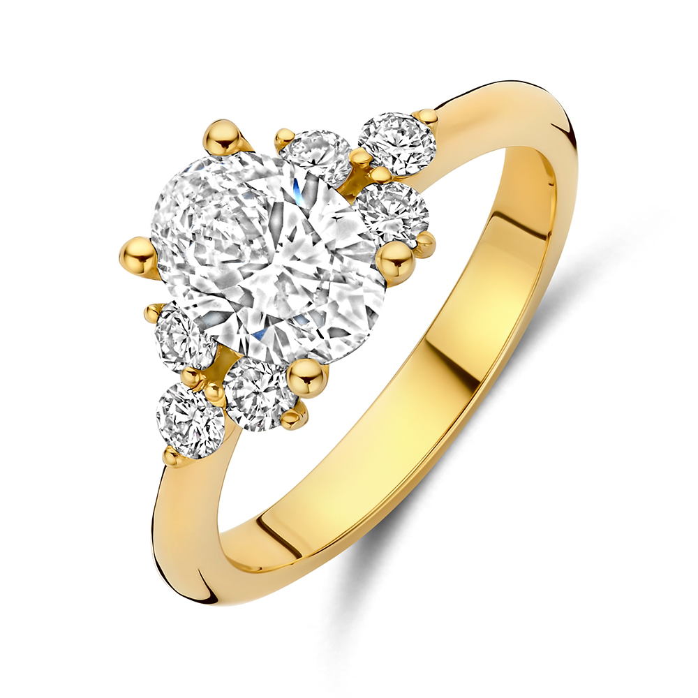 Een elegante ring van 14 karaats goud met een ovale 1.00 ct lab grown diamant als stralend middelpunt. Aan beide zijden van de centrale steen zijn grotere briljant geslepen diamanten van 0.05 ct verwerkt, die zorgen voor een extra krachtig en sprankelend effect.