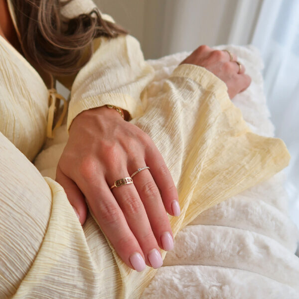 De Bend Ring is een verfijnde 14-karaats gouden ring met een zachte, ovale vorm — een subtiel symbool van verbondenheid. Personaliseer de ring met tot 12 tekens, zoals initialen, een naam of een datum in Romeinse cijfers, en maak er een sieraad van dat jouw verhaal vertelt!