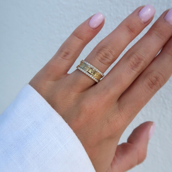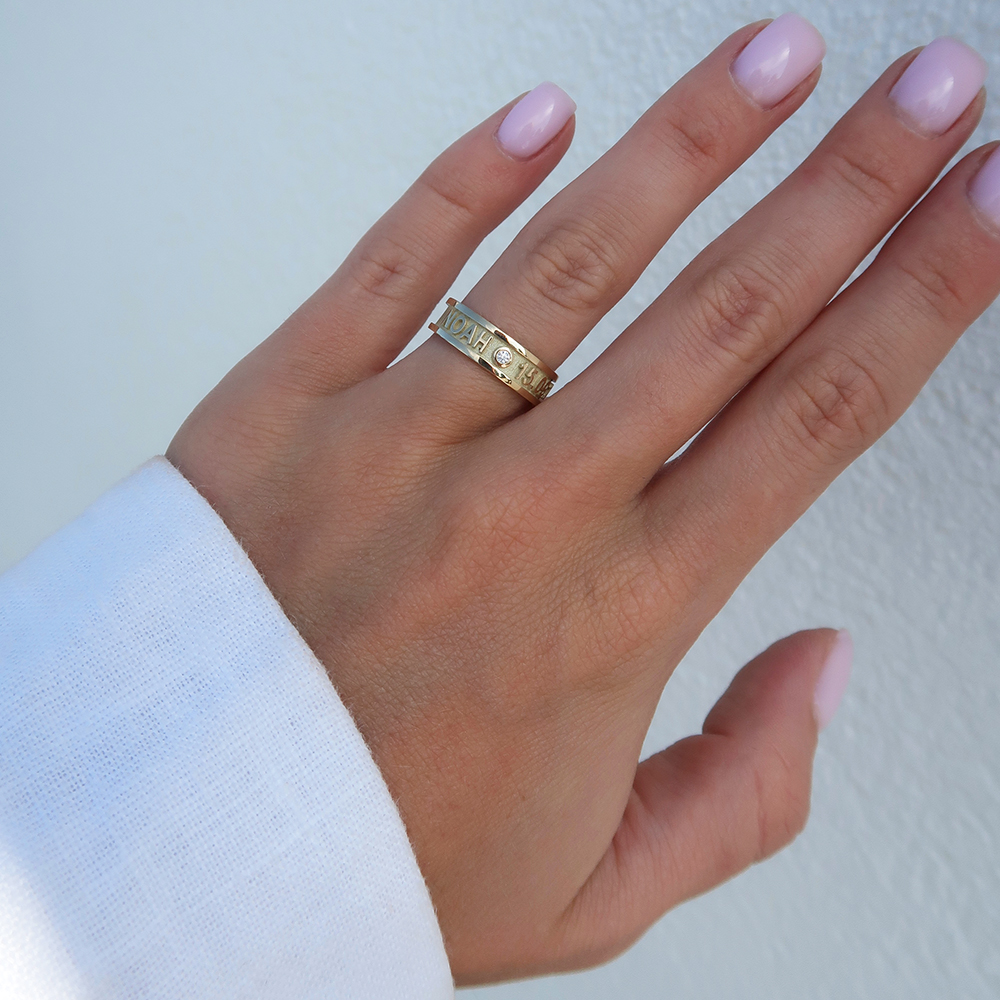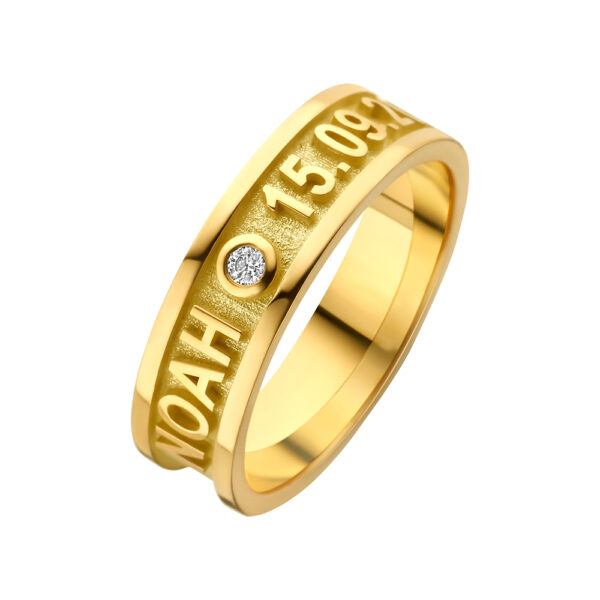 Deze iets bredere variant geeft extra ruimte aan jouw verhaal: personaliseer rondom tot 30 tekens – van initialen en namen tot een bijzondere datum, een hartje of een diamant.