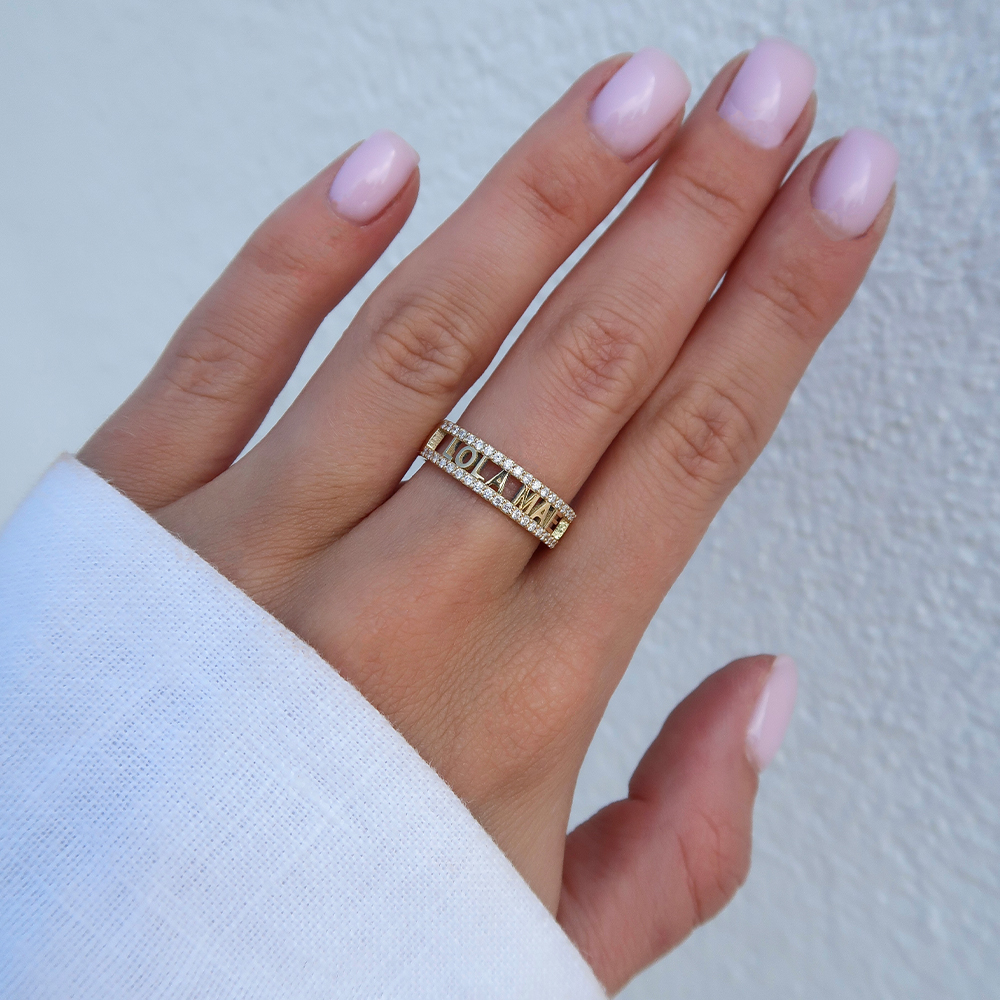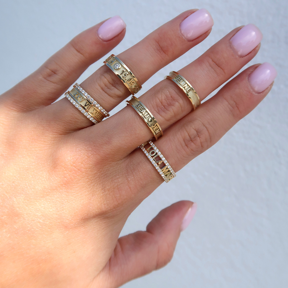 Rondom kun je tot 30 tekens laten graveren – denk aan initialen, namen, een speciale datum, een hartje of een diamant.
