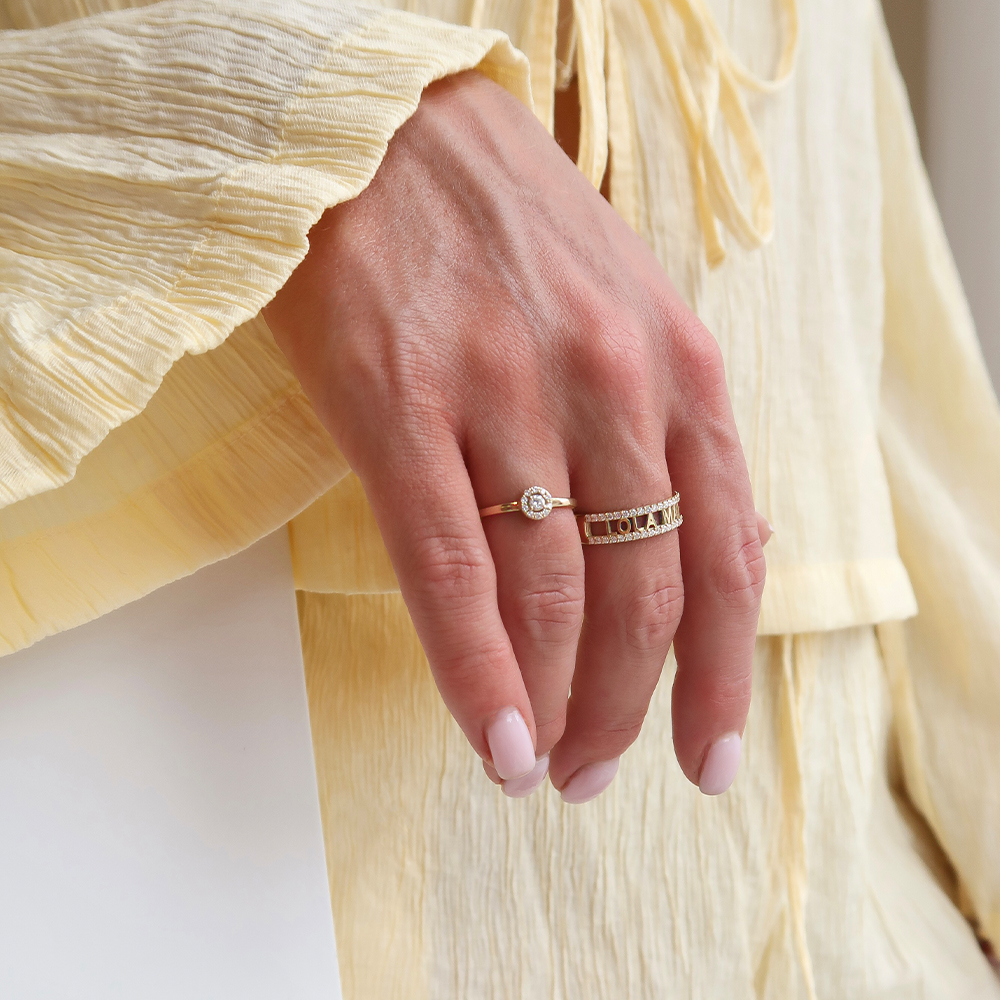 Deze ring combineert ruimte voor personalisatie tussen twee schitterende randen met pavé gezette diamanten.