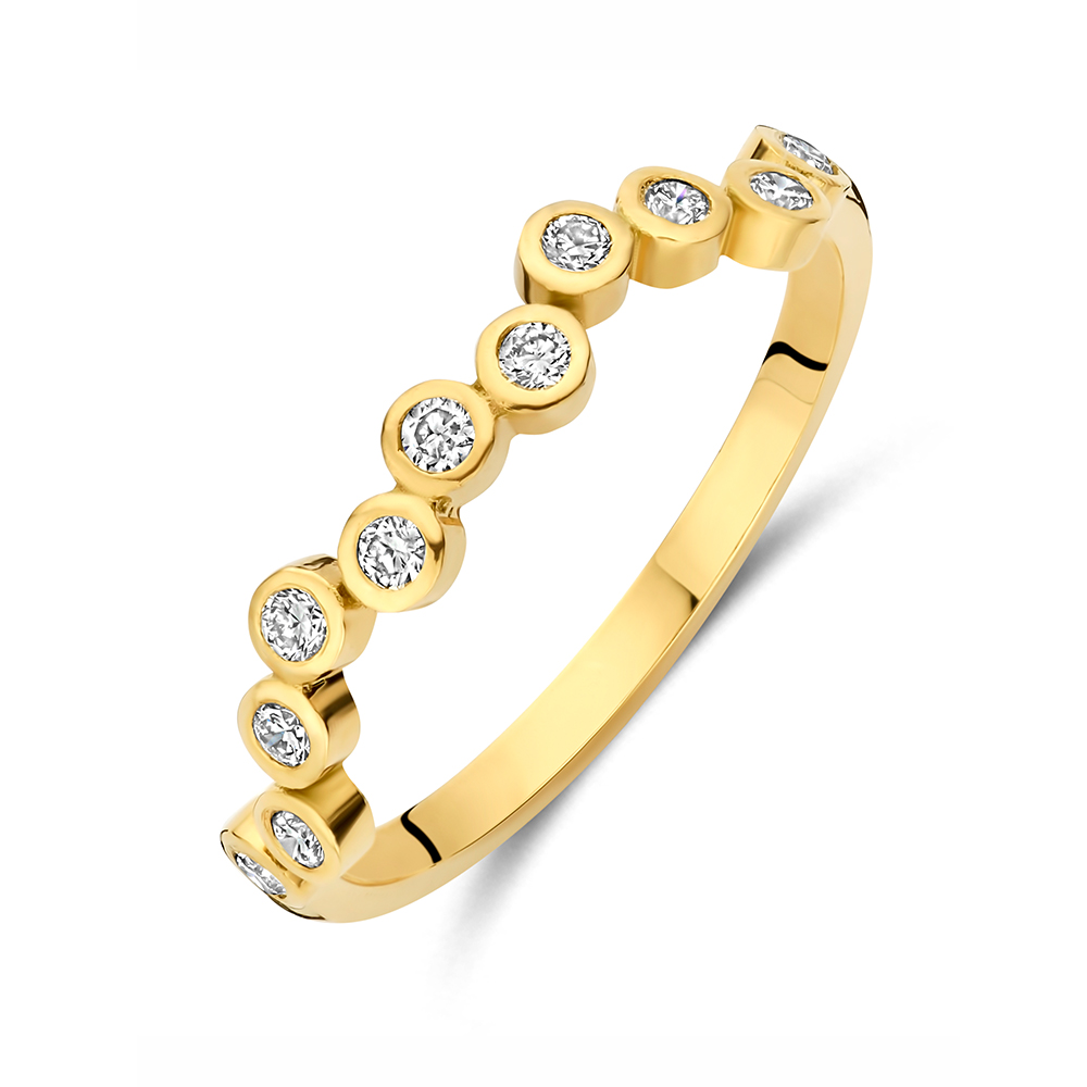 Een speelse ring van 14 karaats goud met een speels rijtje van 0.02 ct briljant geslepen lab grown diamanten in ronde zettingen. De zachte, bolvormige kastjes geven de ring een moderne en subtiele uitstraling.