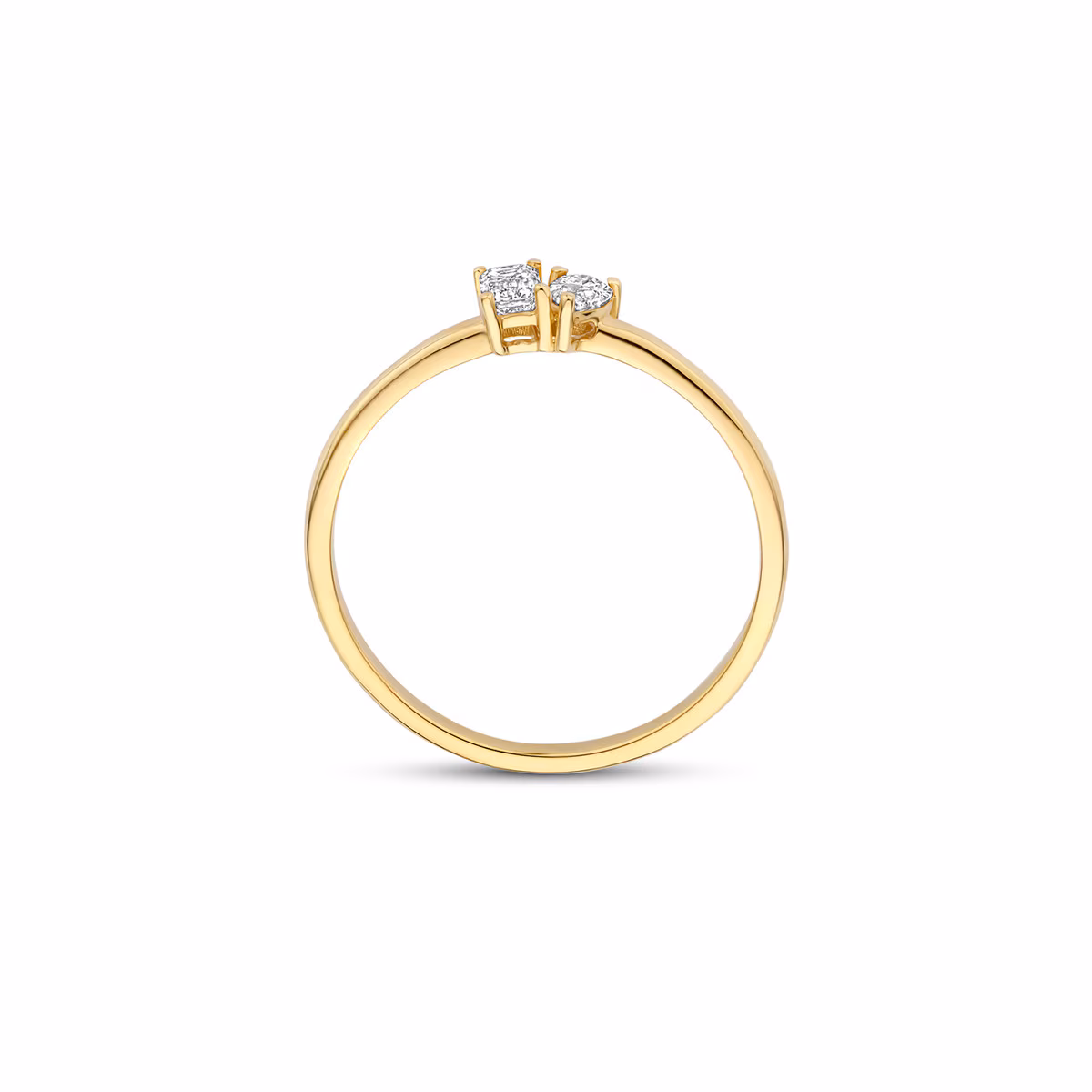 Met een stijlvolle uitstraling is deze ring in 14 karaat geelgoud een echte blikvanger. De twee lab diamonds, een peervormige en een rechthoekige in chaton-zetting, trekken meteen de aandacht. Deze ring is van het merk Blush.