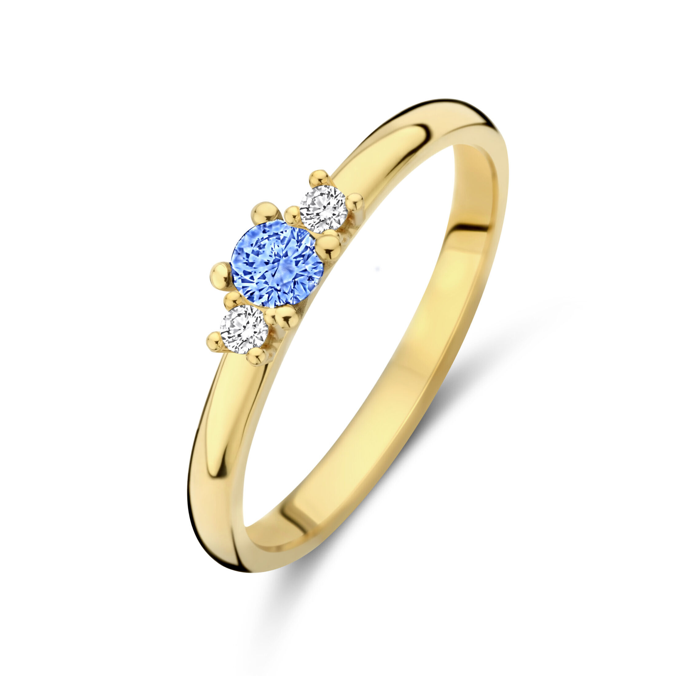 Een schitterende 14-karaats gouden ring met een prachtige saffier, omlijst door twee diamanten.