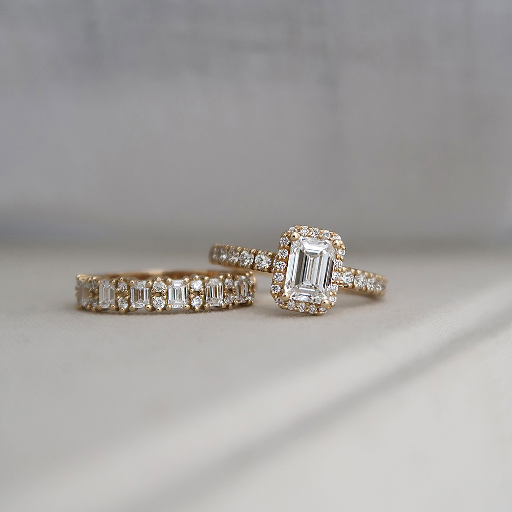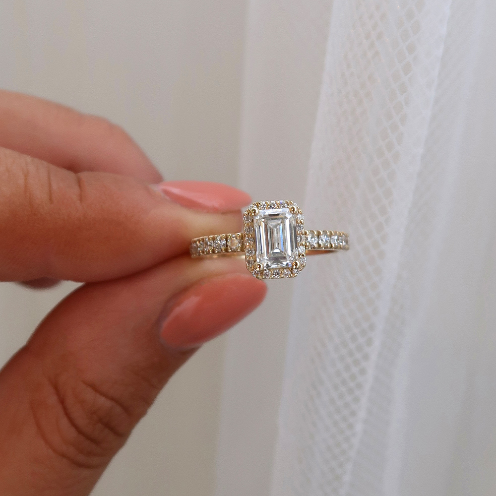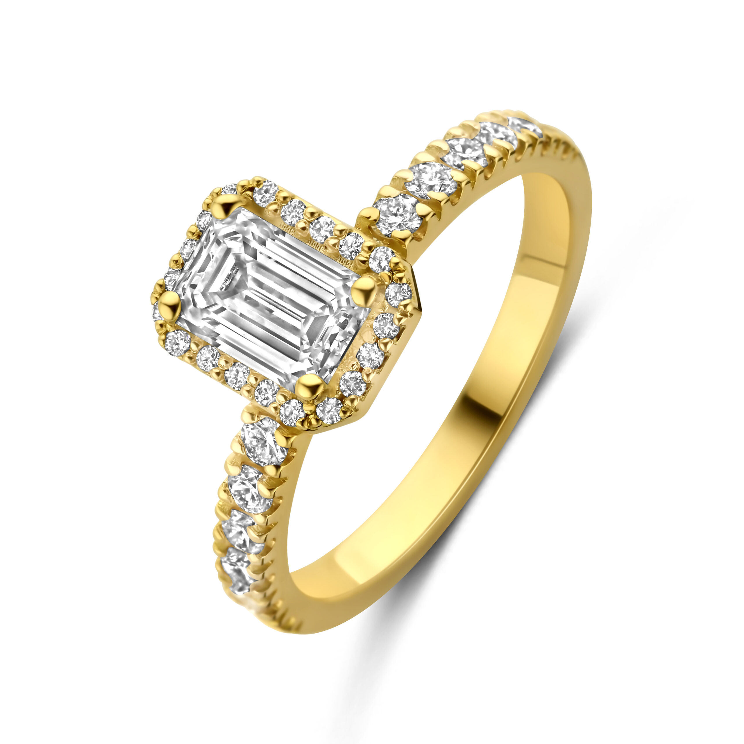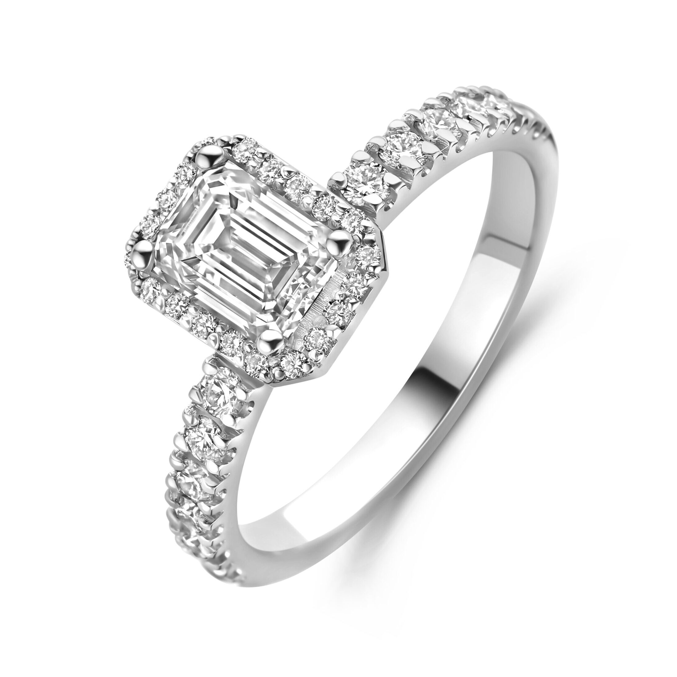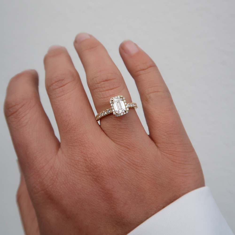 Centraal pronkt een smaragdgeslepen lab-grown diamant van 1.00 ct, omlijst door een halo van kleinere diamanten voor maximale schittering.