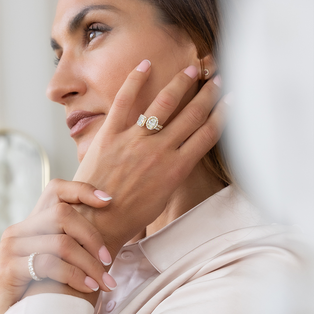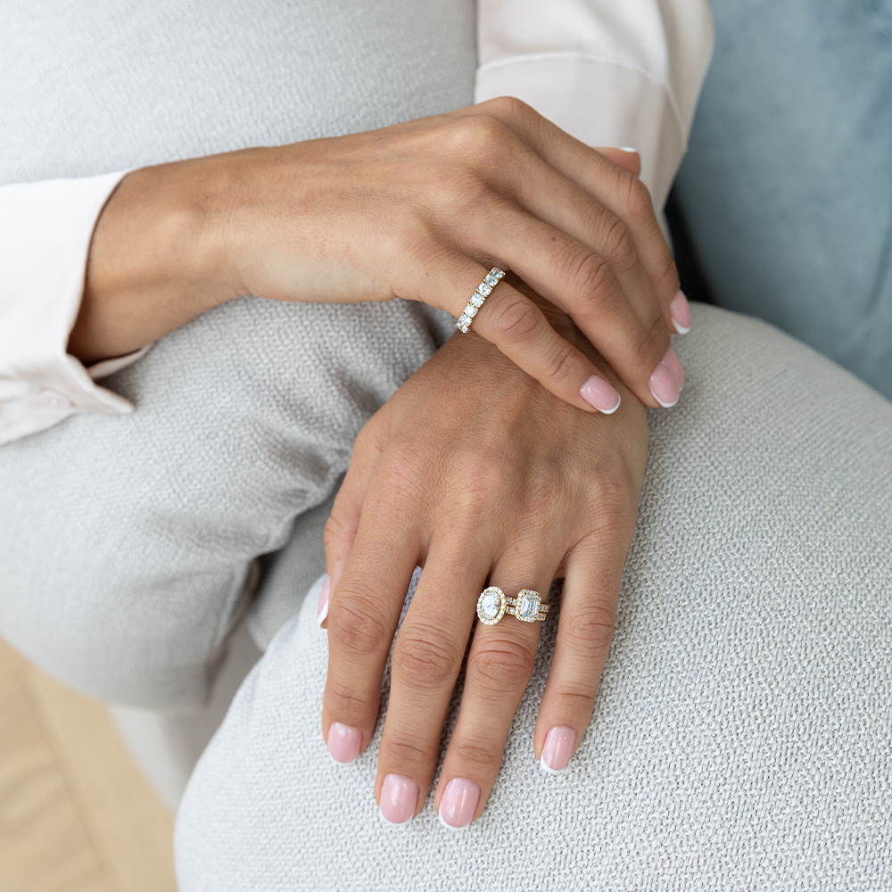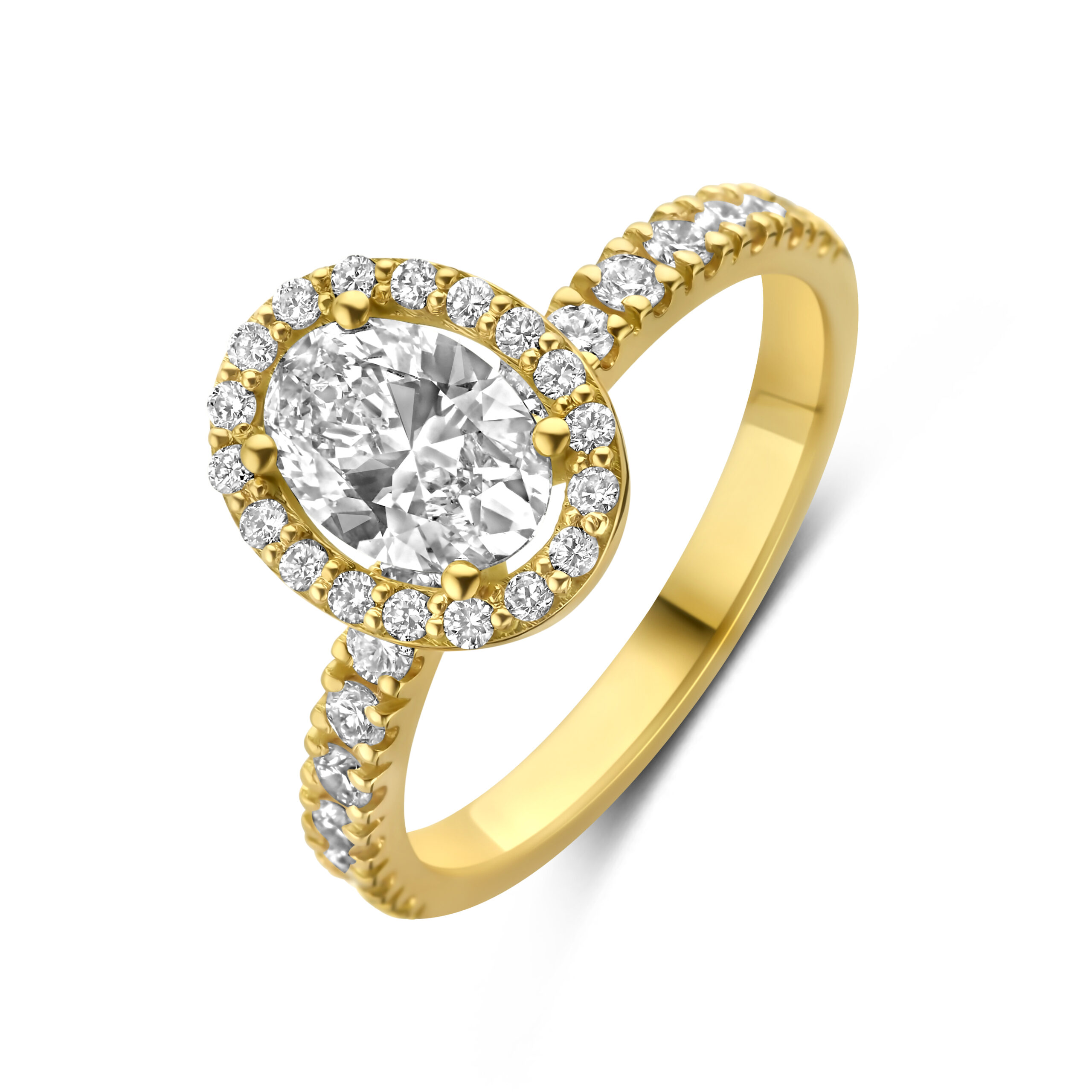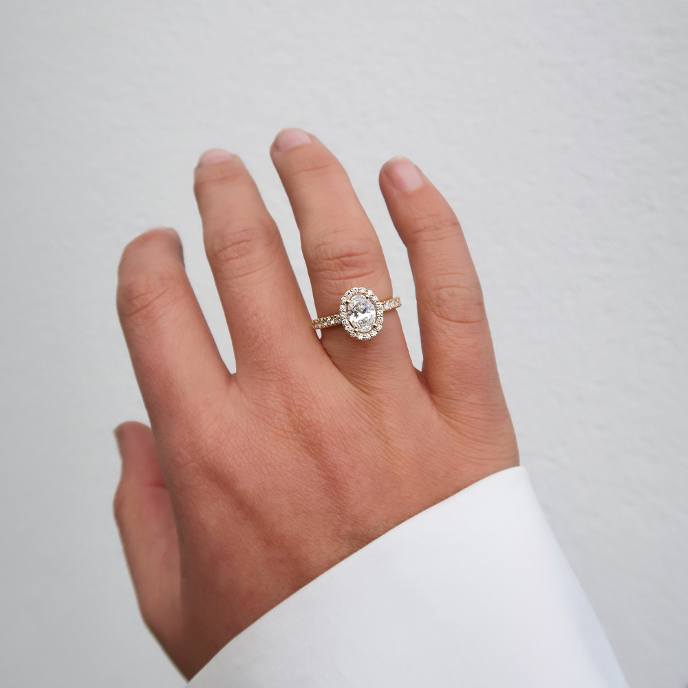 Centraal schittert een ovale lab-grown diamant van 1,00 ct, omlijst door een halo van kleinere diamanten voor maximale schittering.