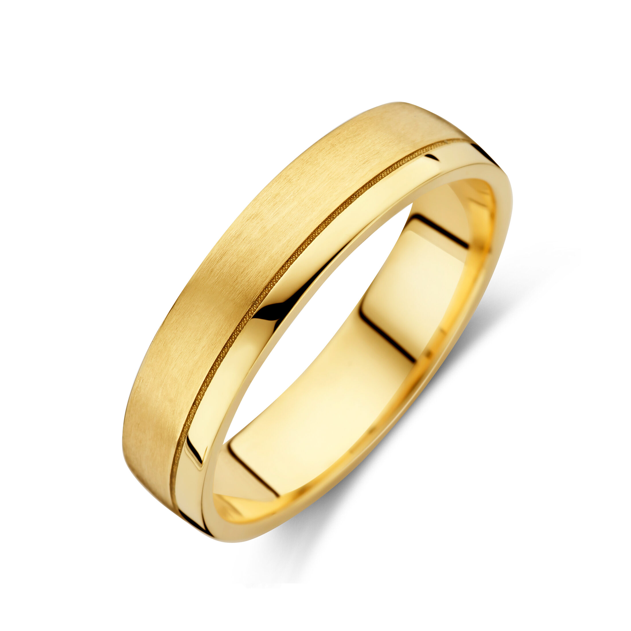 Deze ring, vervaardigd uit 14-karaats goud, combineert een gepolijste afwerking met een matte textuur, wat een prachtig contrast creëert dat zowel modern als tijdloos is!