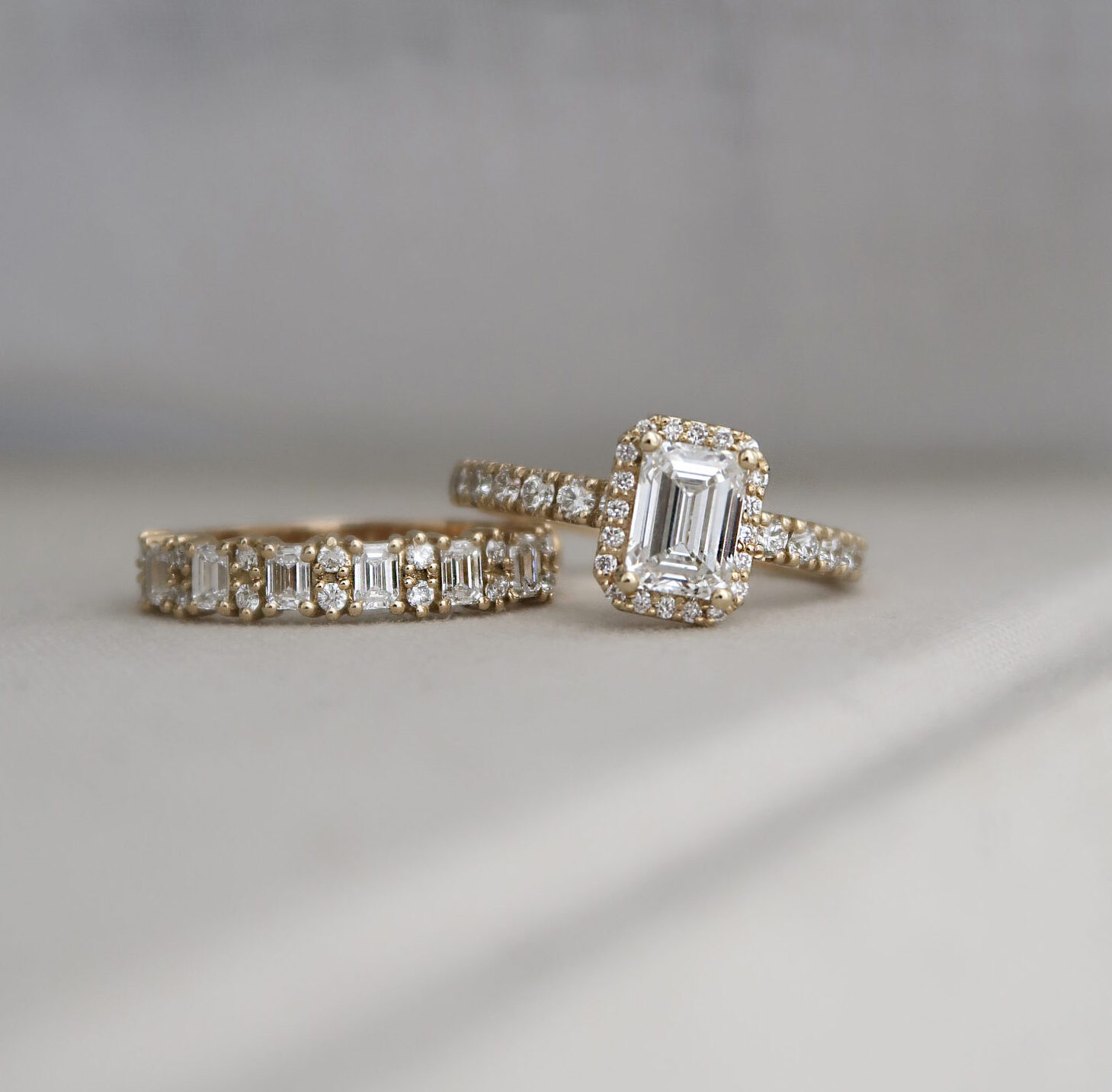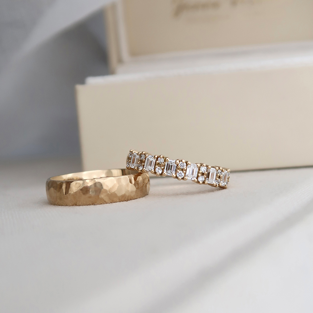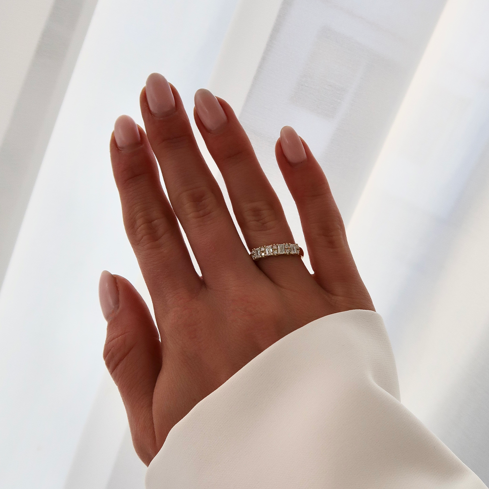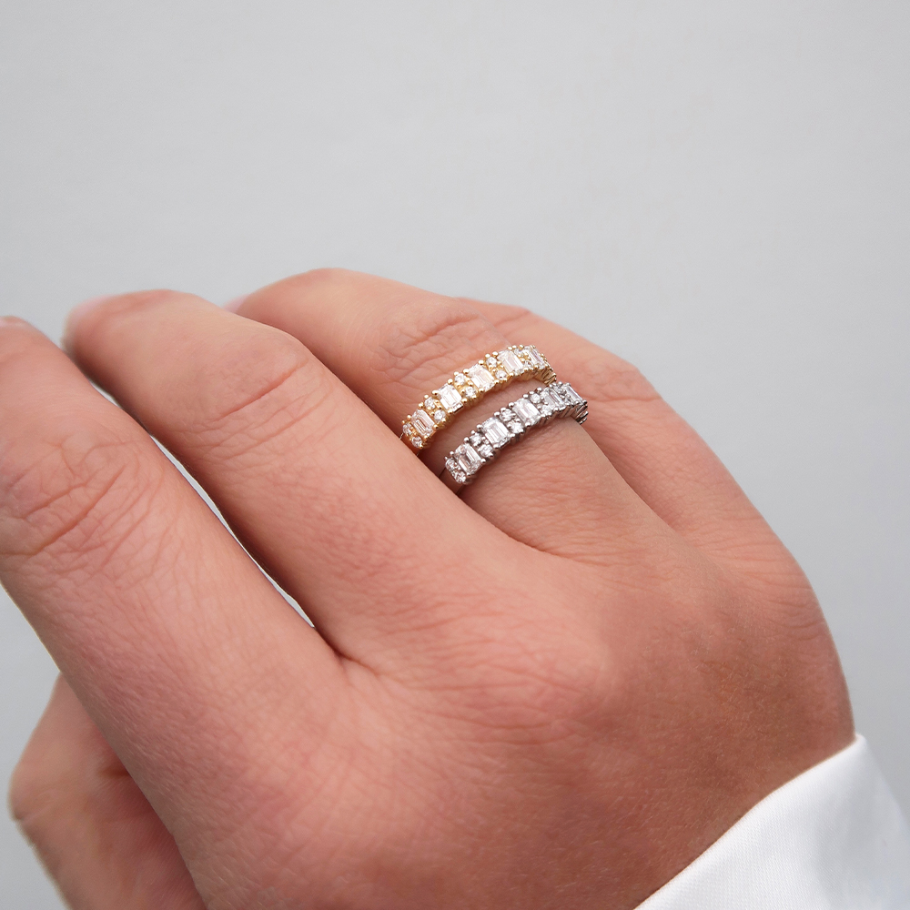Een Memoire ring, die prachtig is bezet met een rij Emerald geslepen diamanten, die worden afgewisseld met schitterende ronde briljanten. Deze combinatie creëert een perfect balans tussen modern en klassiek.