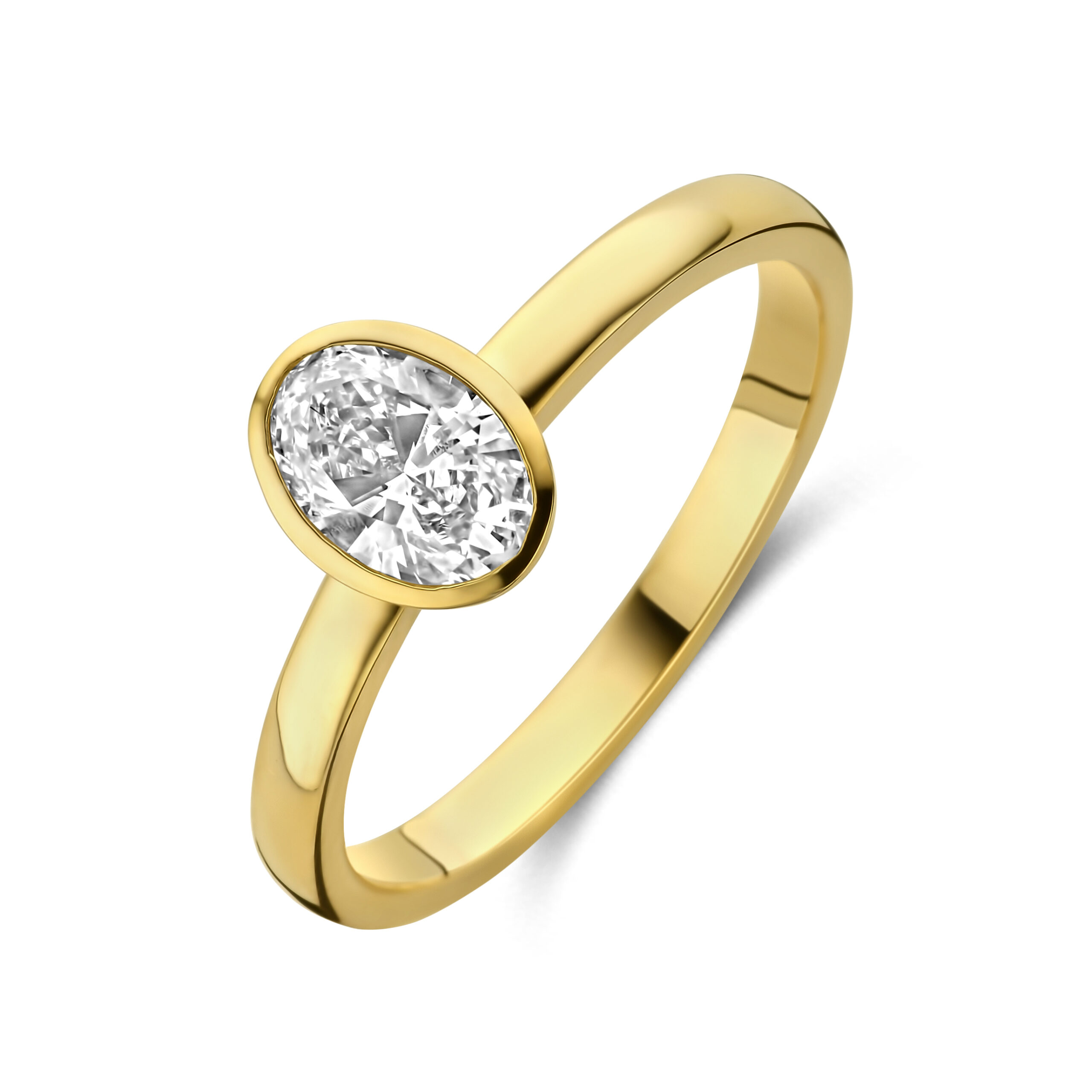 In het middelpunt schittert een oogverblindende 0.50 ct ovale diamant, prachtig gezet in een gladomlijst montuur dat de steen optimaal tot zijn recht laat komen.