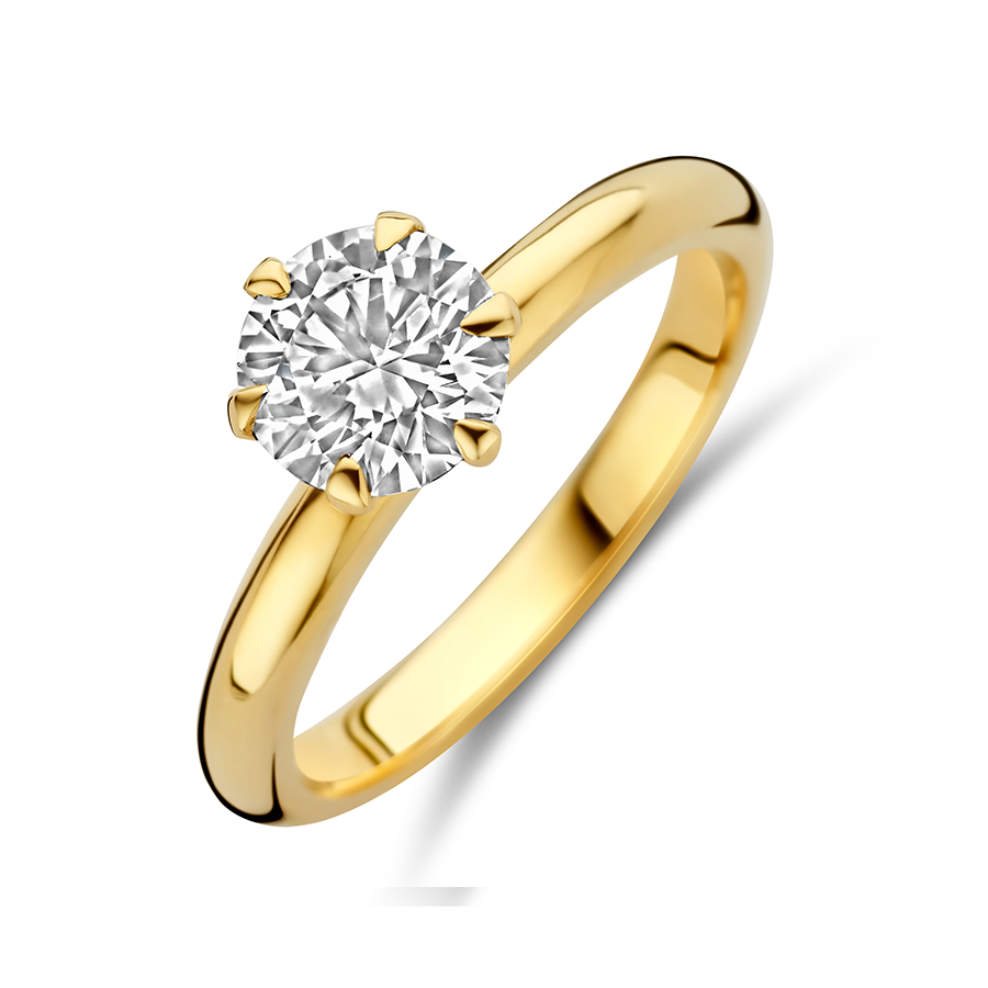 Een klassieke en tijdloze solitaire ring, vervaardigd uit 14-karaats geelgoud.