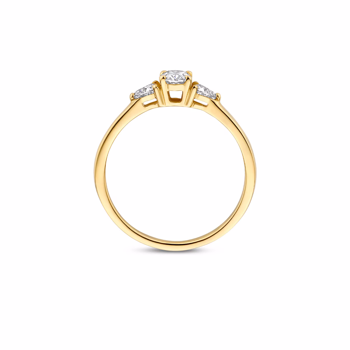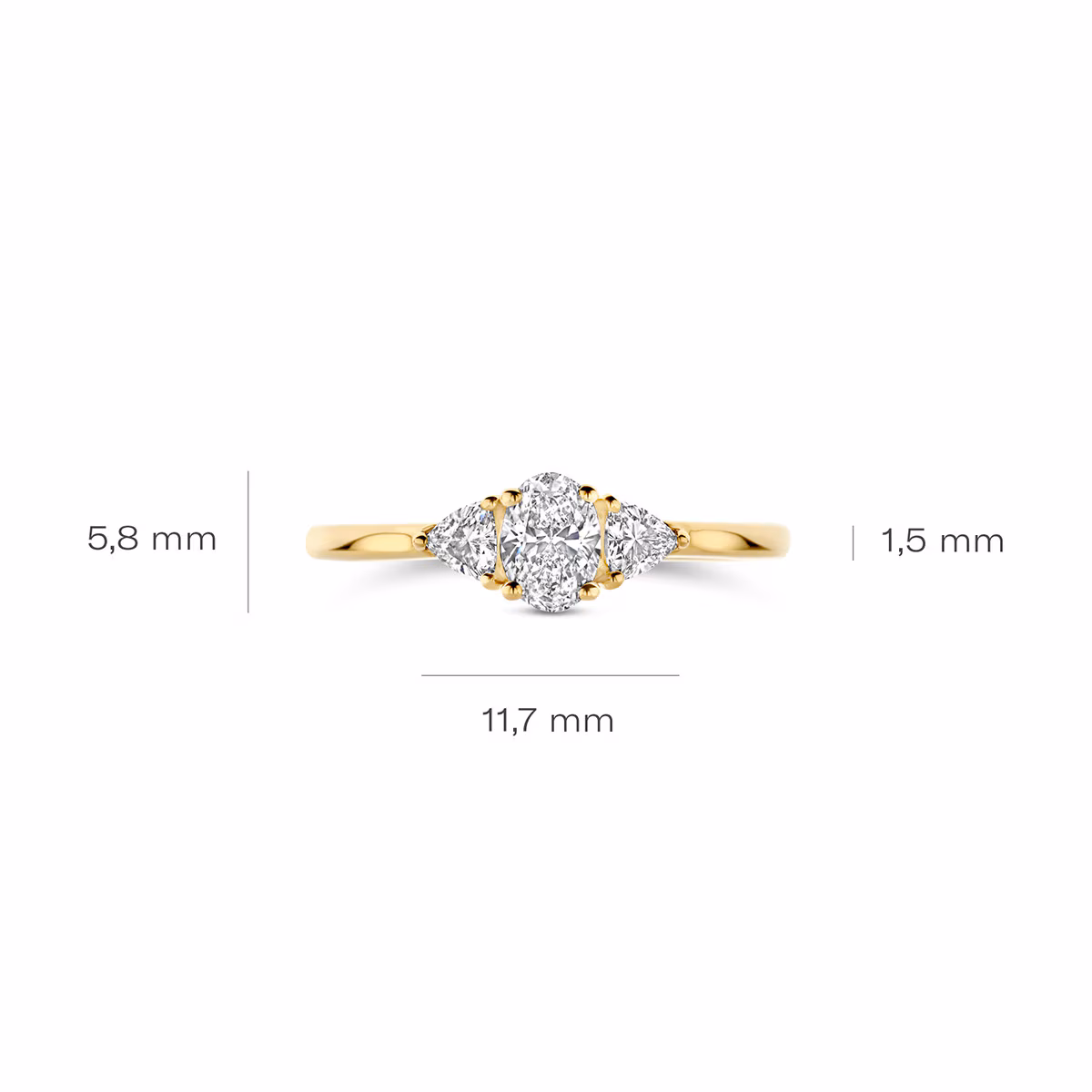 Met zijn speelse ontwerp is deze 14k geelgouden ring echt een eyecatcher. De drie lab-diamonds in ovale en driehoekige vormen vallen meteen op en geven de ring een vrolijke, sprankelende look. Deze ring van het merk Blush.