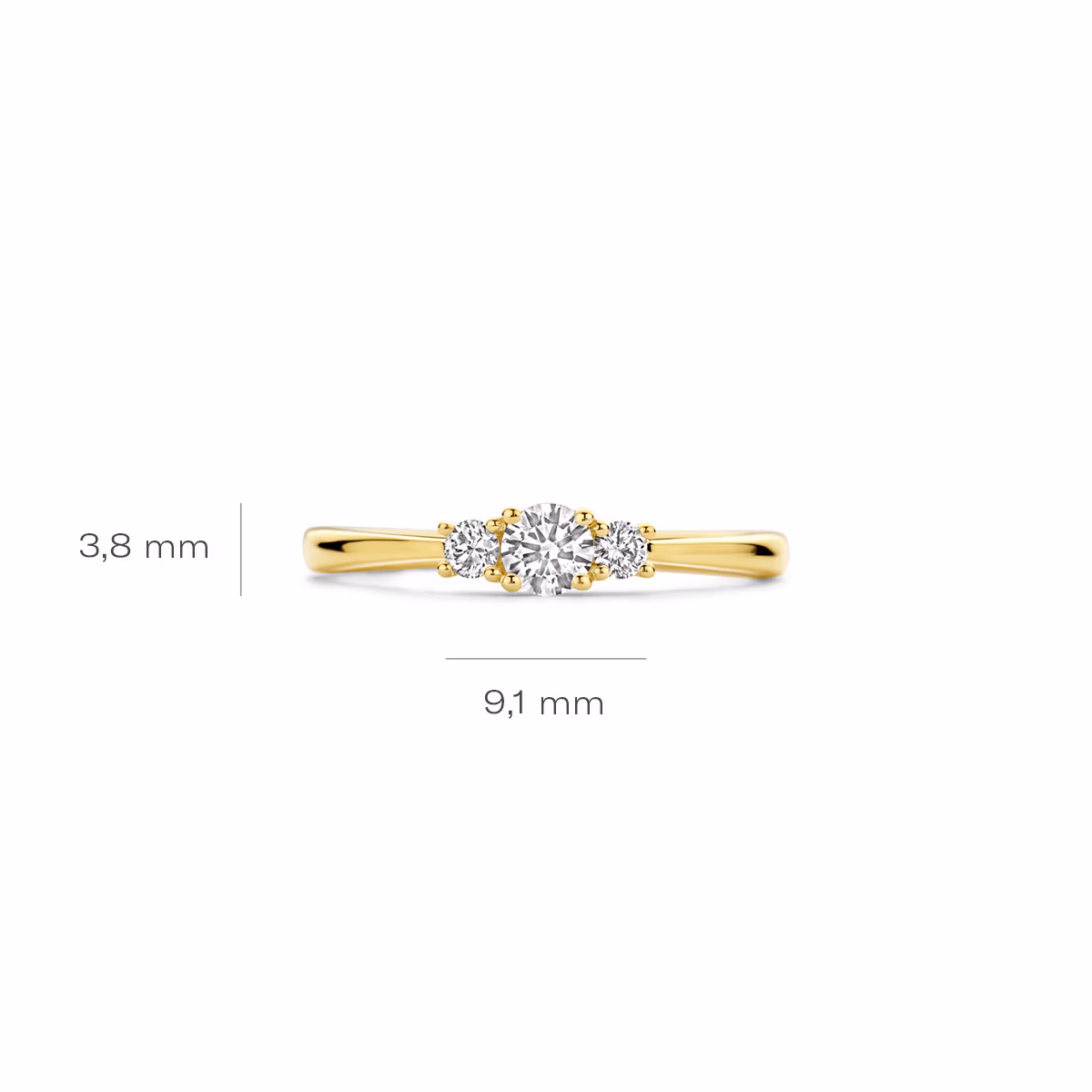 Deze ring is gemaakt van 14 karaat goud en is gezet met drie briljant geslepen lab-grown diamanten met een totaalgewicht van 0.32 karaat en een stenenbreedte van 9.1 mm.