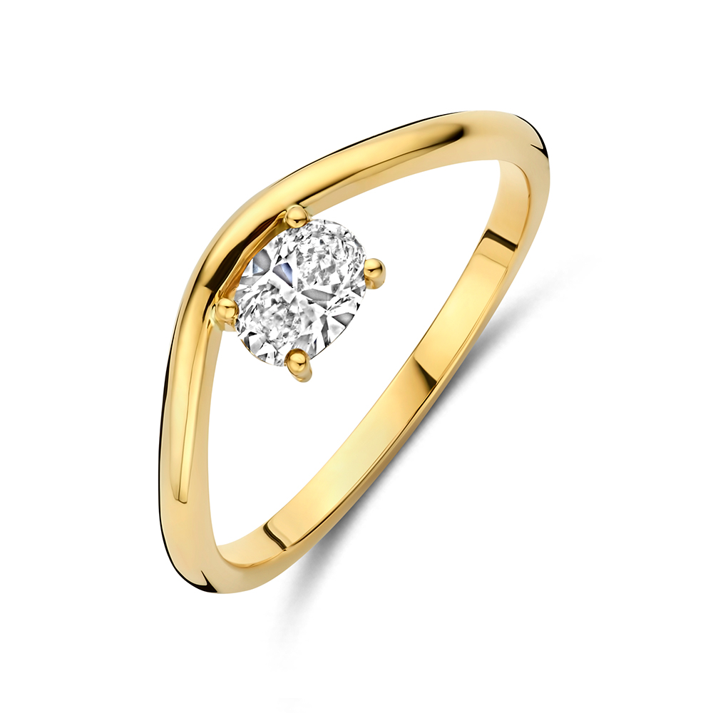 Een verfijnde ring van 14 karaats goud met een 0.25 ct ovale lab grown diamant in een moderne, open zetting. De subtiel gebogen band omsluit de steen op een elegante manier, waardoor de diamant als het ware lijkt te zweven.