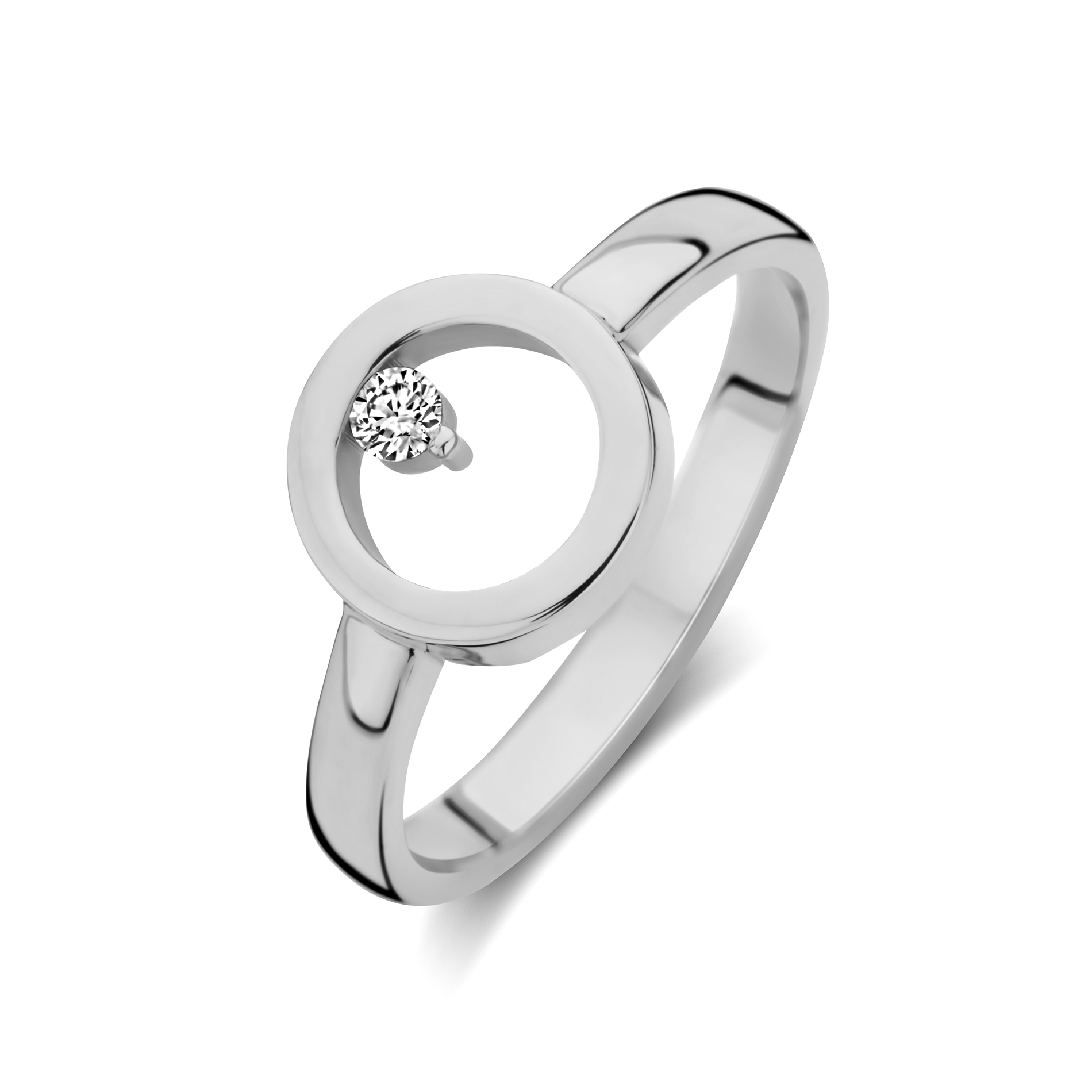 Deze Zilveren Circle ring is een variant van de Circle collectie en bevat een cirkel met een zirkonia, wat zorgt voor een subtiele en toch opvallende uitstraling.