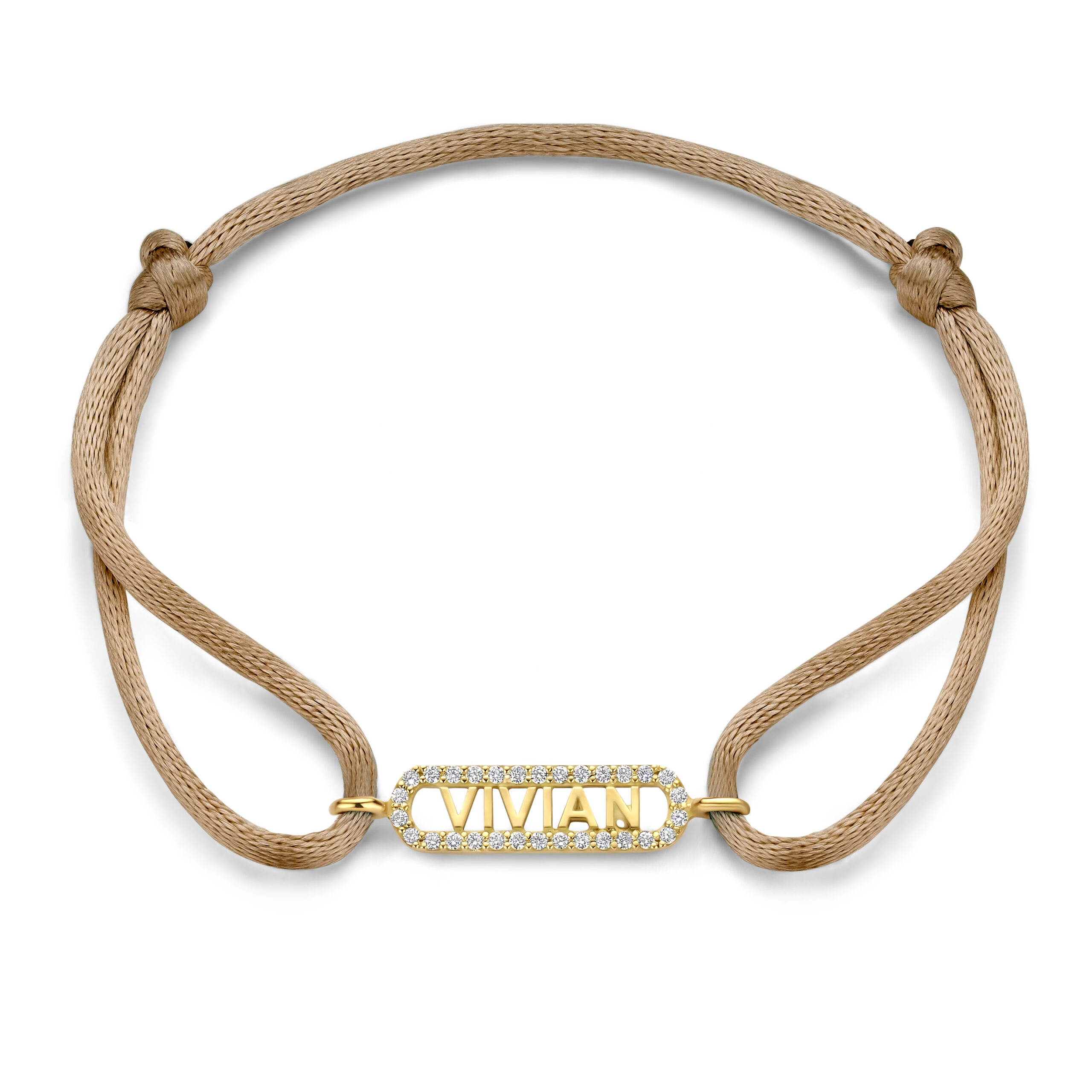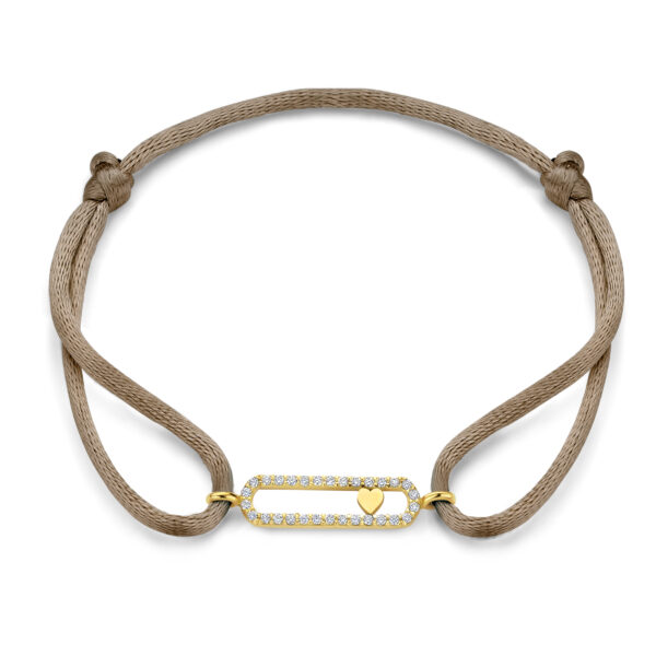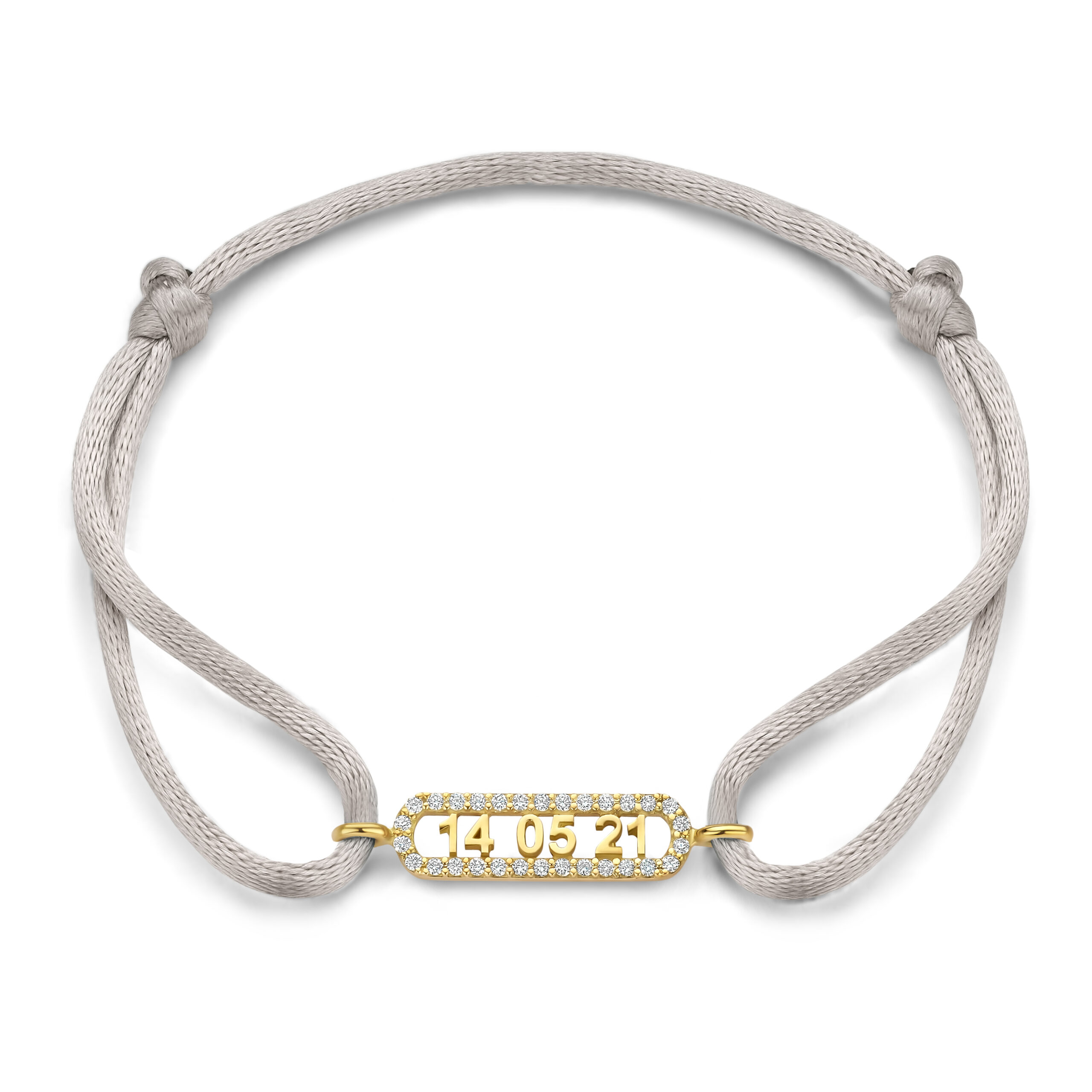 De 14-karaats gouden bedel, omlijst met fijne pavé gezette diamanten, schittert subtiel tegen het zachte satijnen koord.