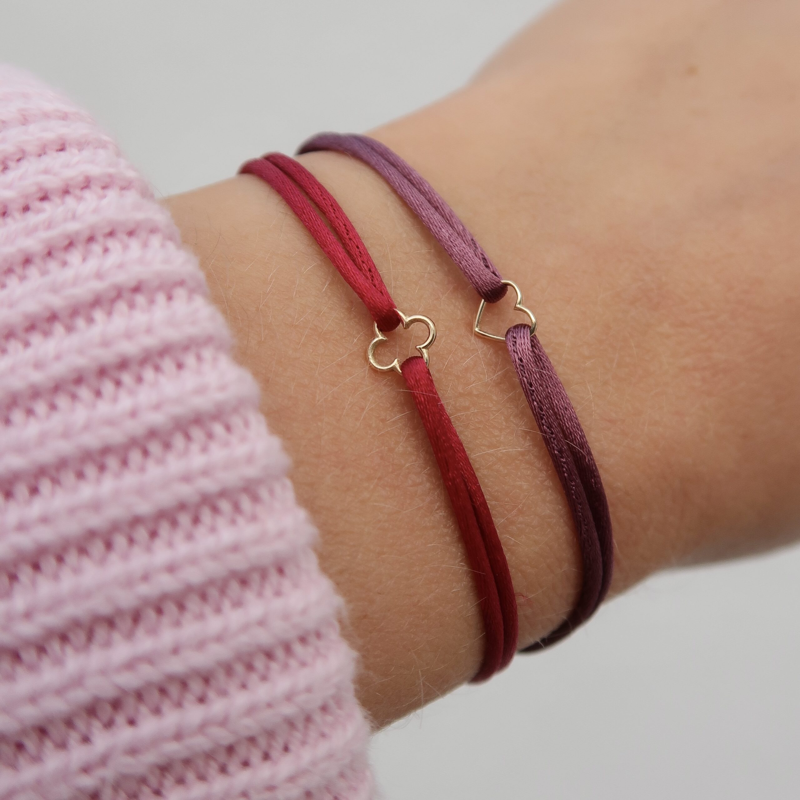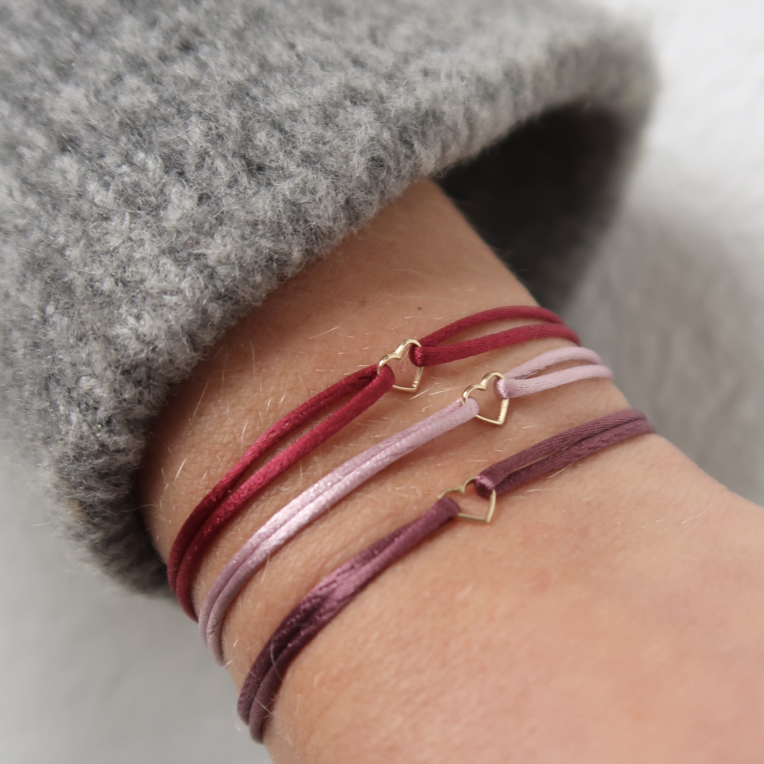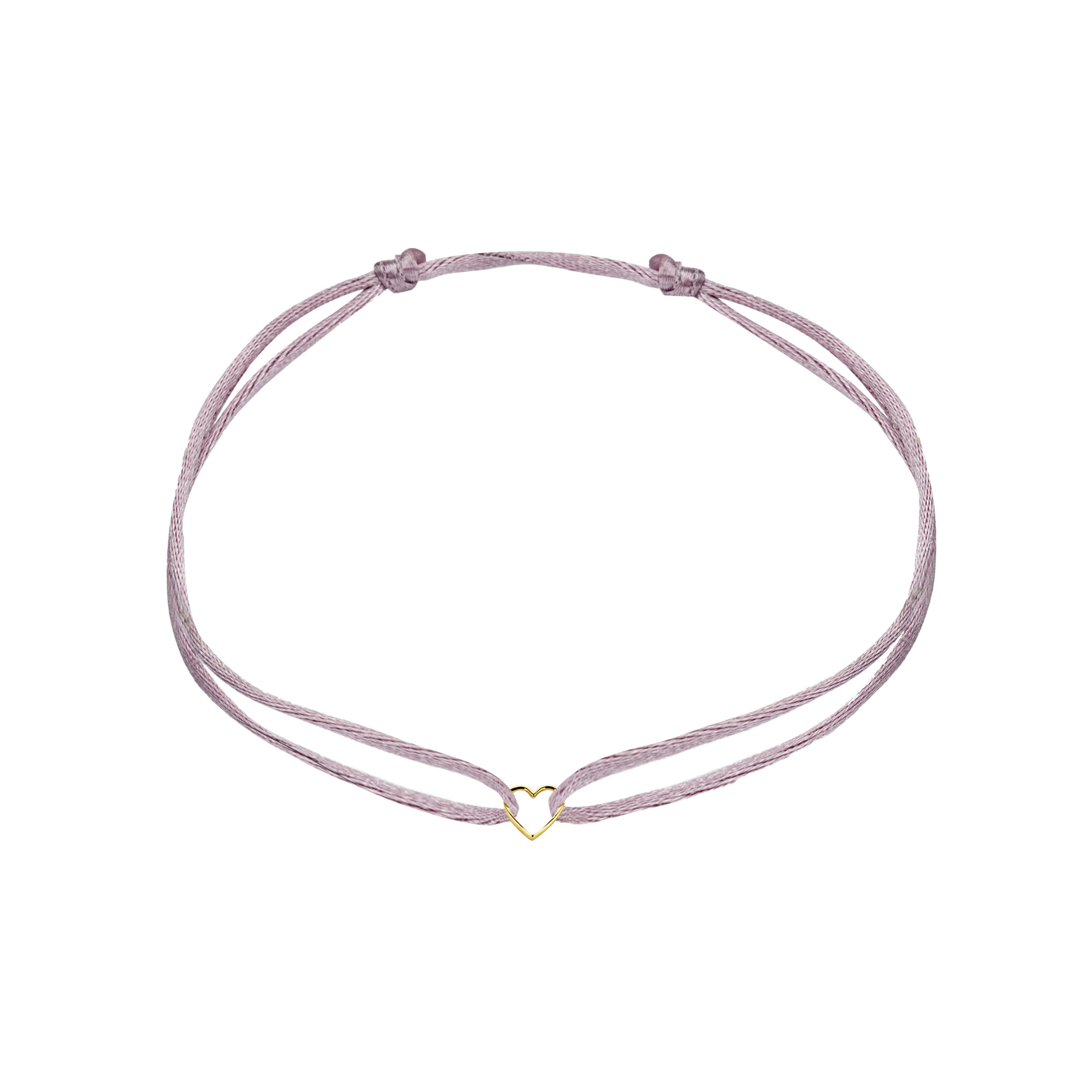 Een satijnen armbandje met een 14-karaats geelgouden open hartjesbedel.