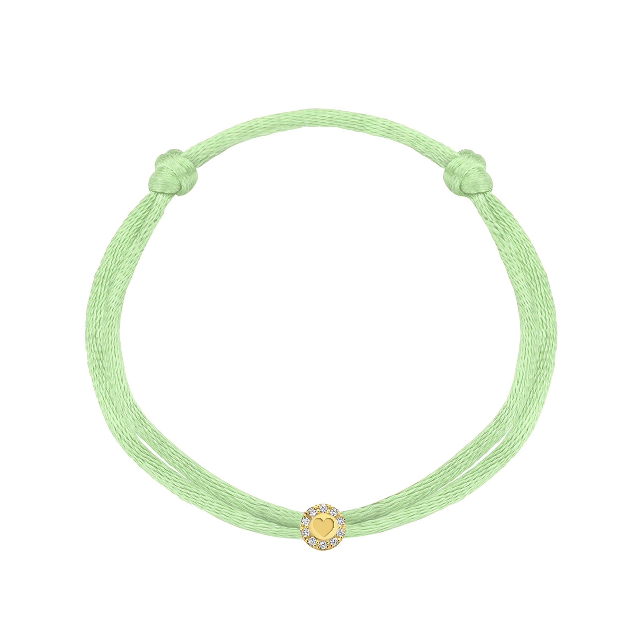 De armband is gemaakt van zacht, verstelbaar satijnkoord en afgewerkt met een 14-karaats gouden bedel, omlijst door een halo van fonkelende pavé gezette diamanten. In het midden schittert een initiaal of symbool naar jouw keuze.