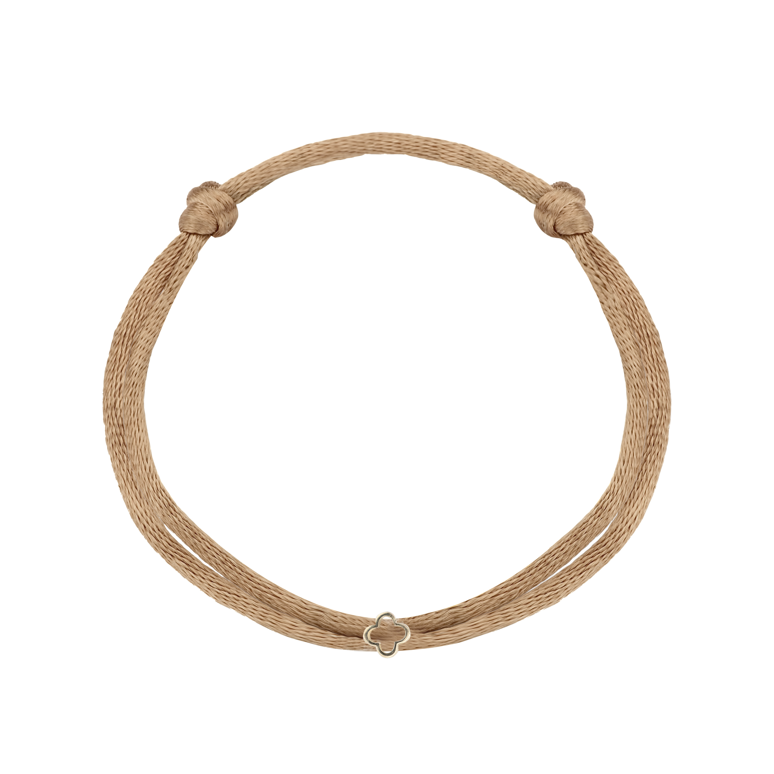 Een satijnen armbandje met een 14-karaats geelgouden open dubbele klavertjesbedel.